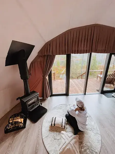 - В глэмпинге разрешено проживание с собаками. Проживание других животных запрещено. Стоимость услуги (1500 ₽) взымается разово на месте для каждой собаки за весь период проживания.