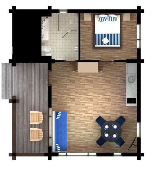 Коттедж рассчитан до четырех персон со всеми удобствами. Для тех кто хочет в уединении отдохнуть и насладиться уловом. Спальные места представлены в виде одной двуспальной кровати и одного дивана.