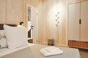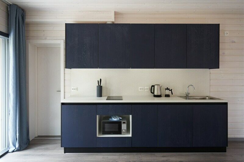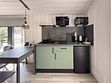 Дом-студия рассчитан на 2 человека с оптимальным зонированием, включающим кухонную, обеденную и спальную зоны.