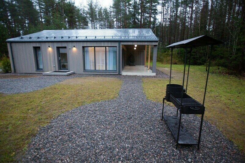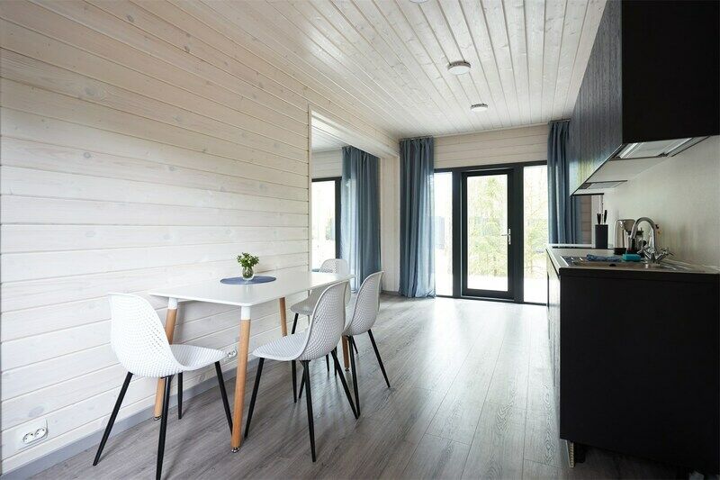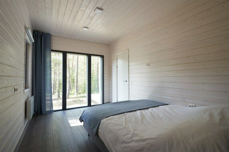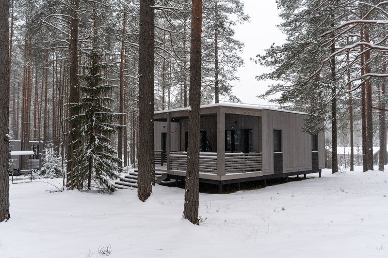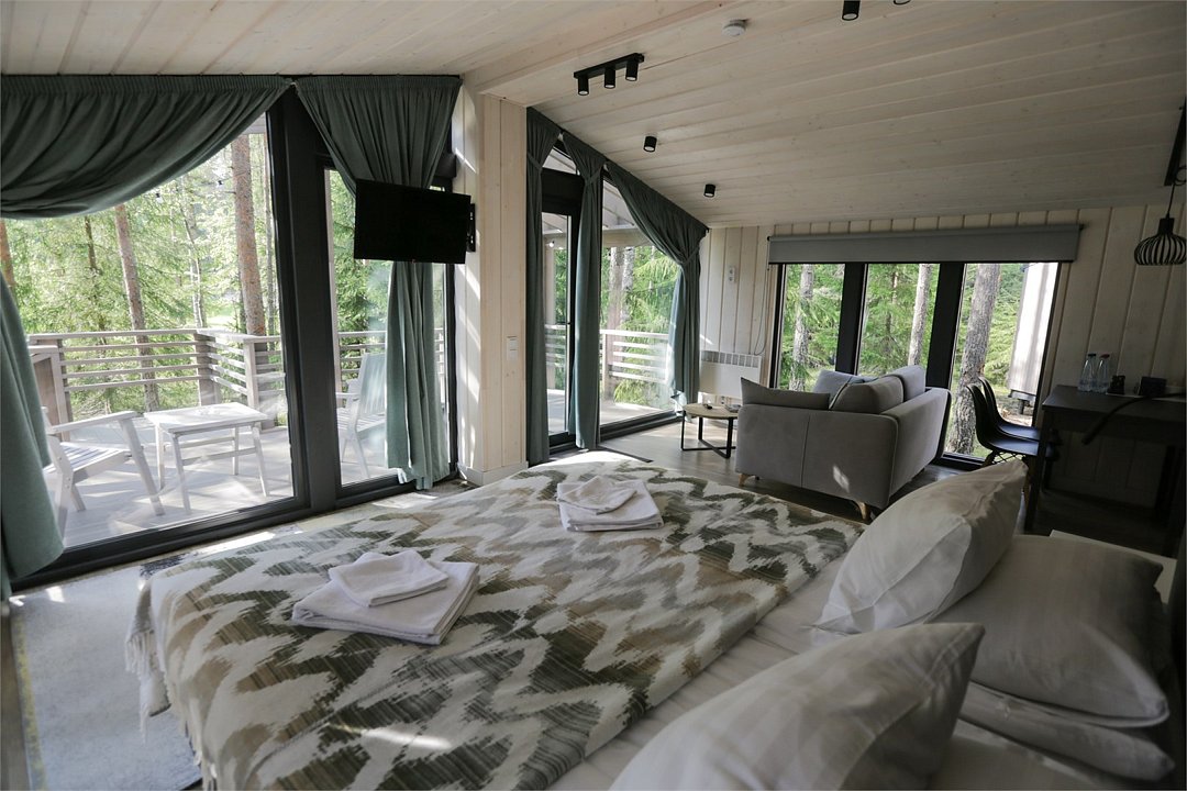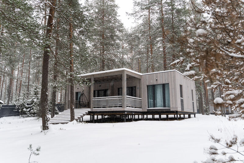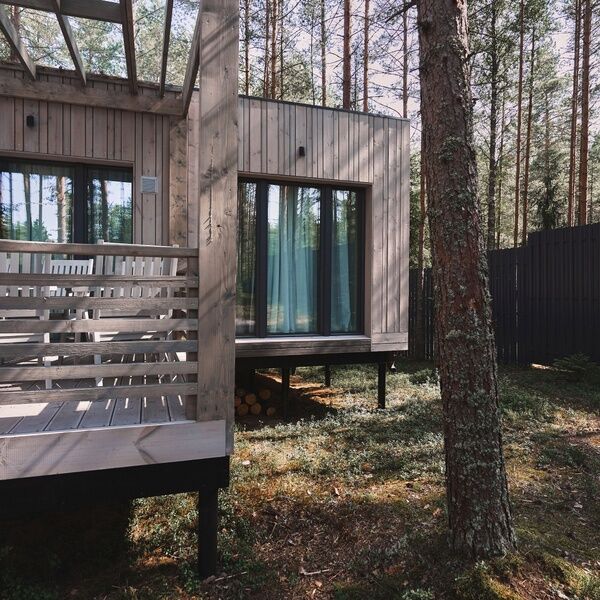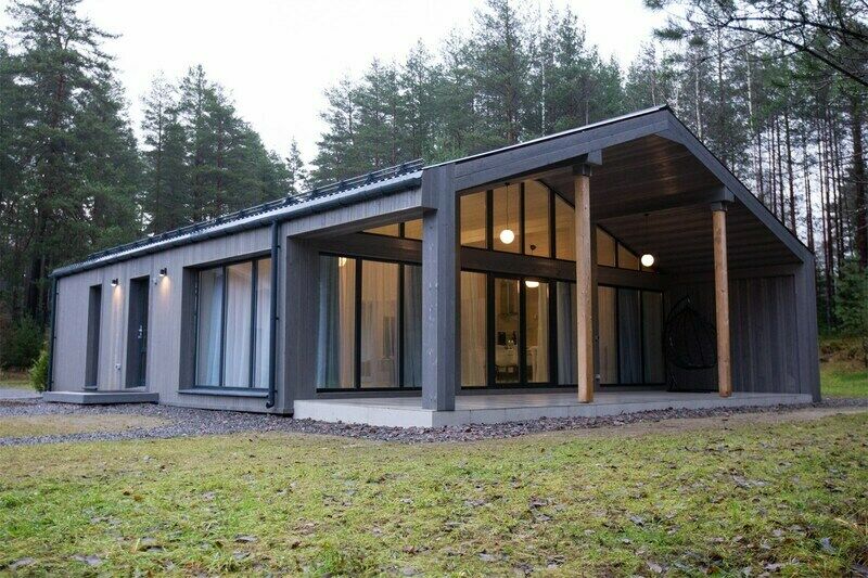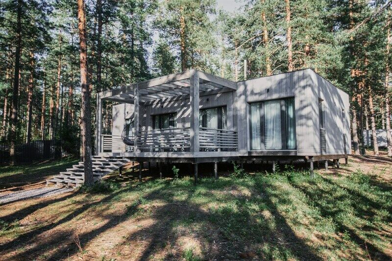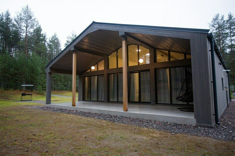 Через панорамные окна открывается потрясающий вид на лес Карельского перешейка. Дом рассчитан на 4 (+2) человек, две спальни и большая кухня-гостиная.