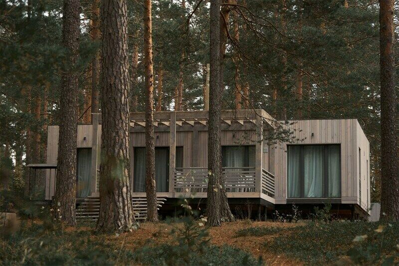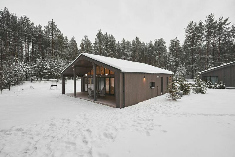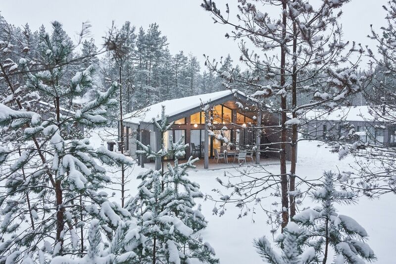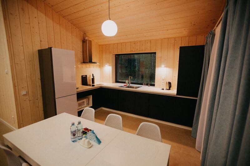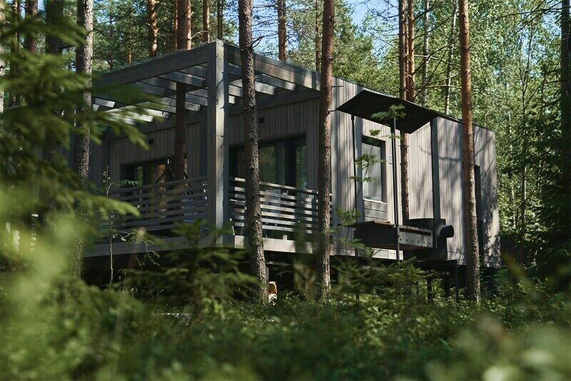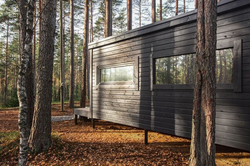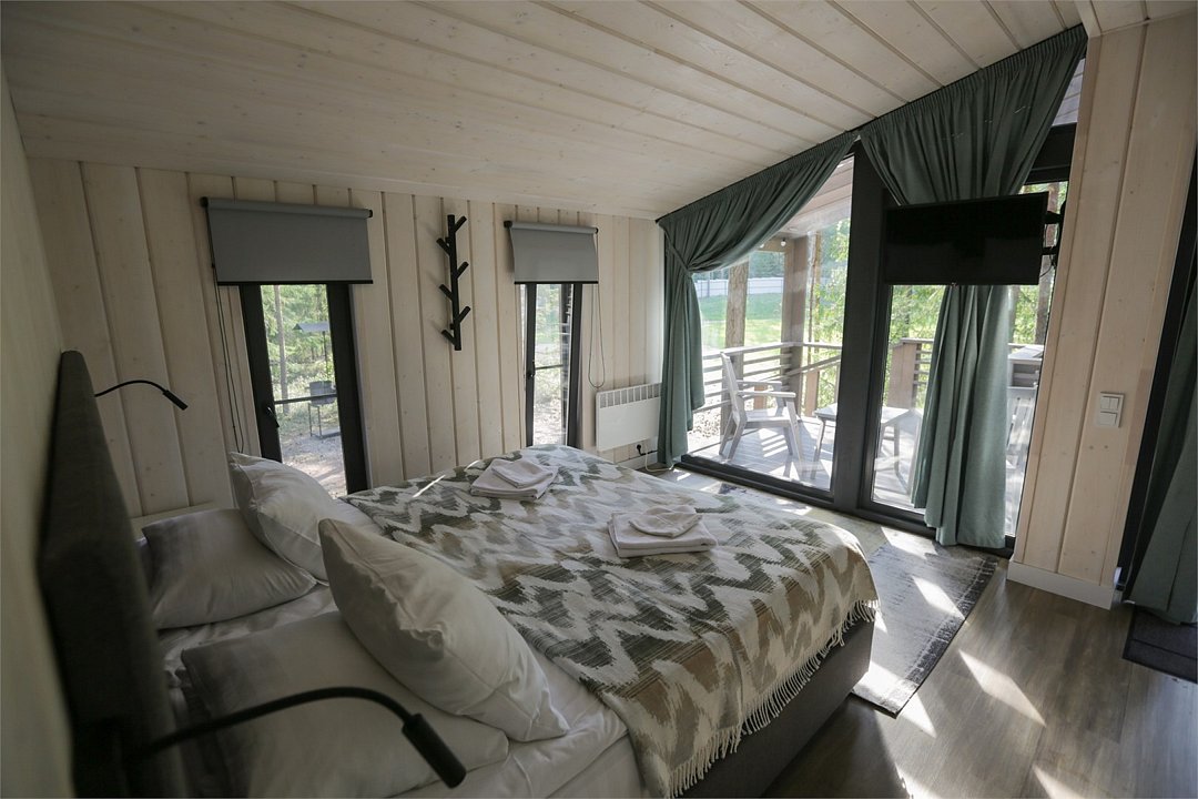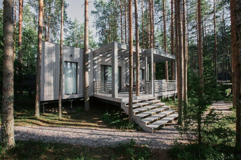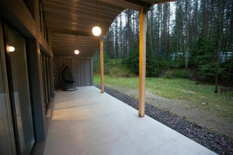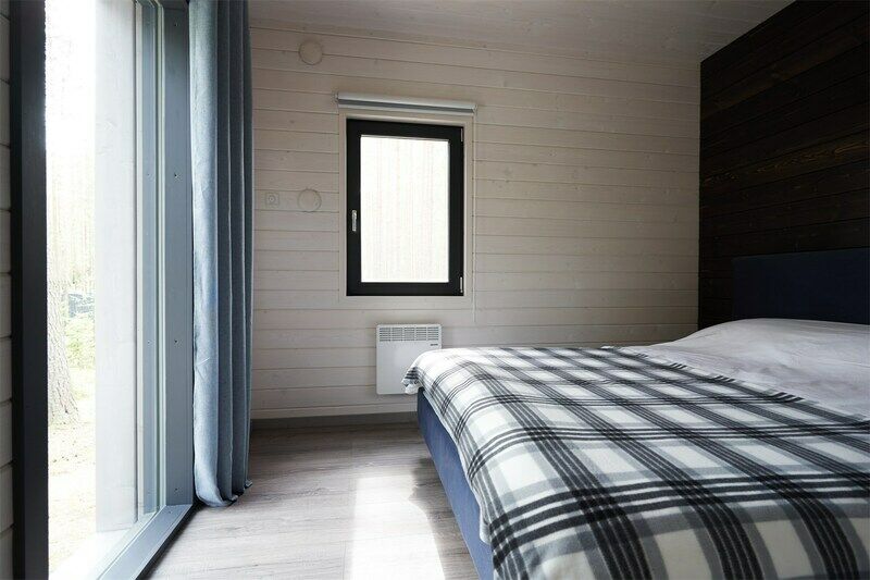 Через панорамные окна открывается потрясающий вид на лес Карельского перешейка. Дом рассчитан на 4 (+2) человек, две спальни и большая кухня-гостиная.
