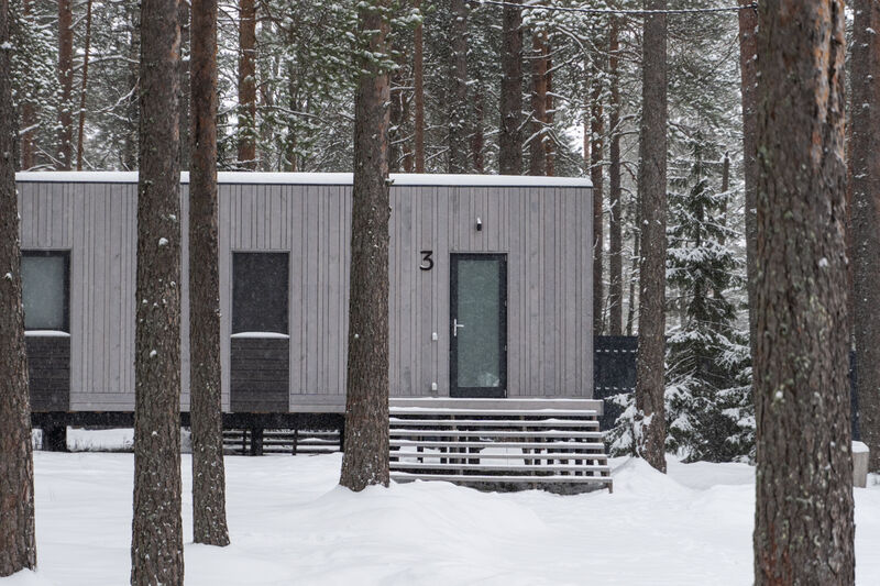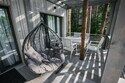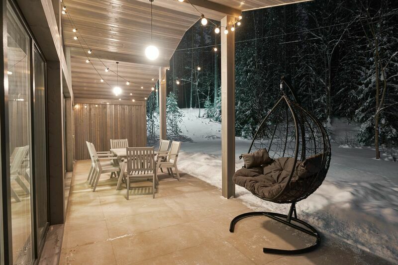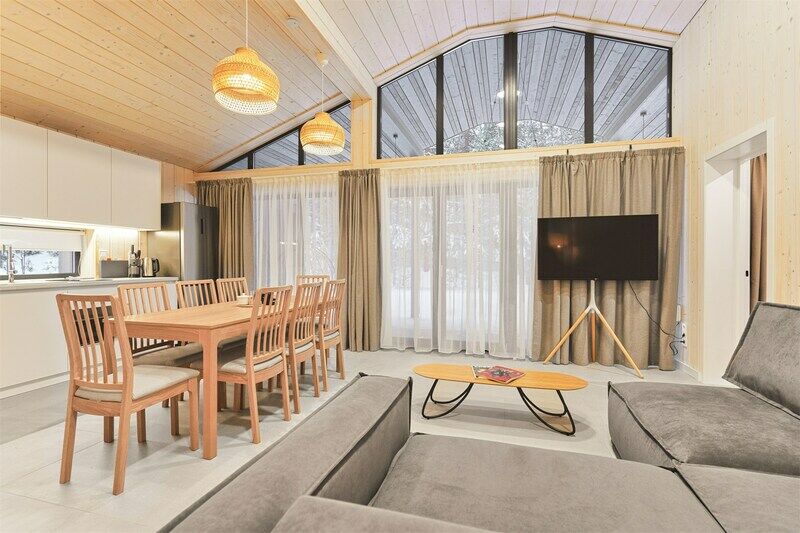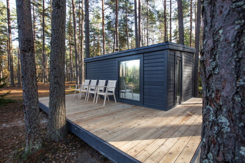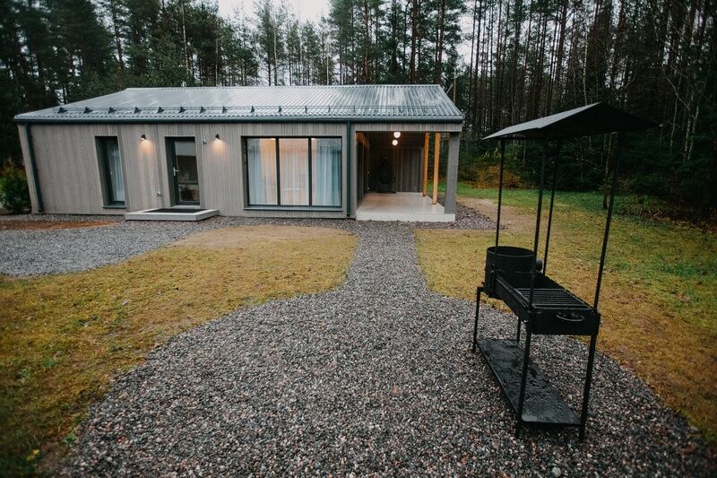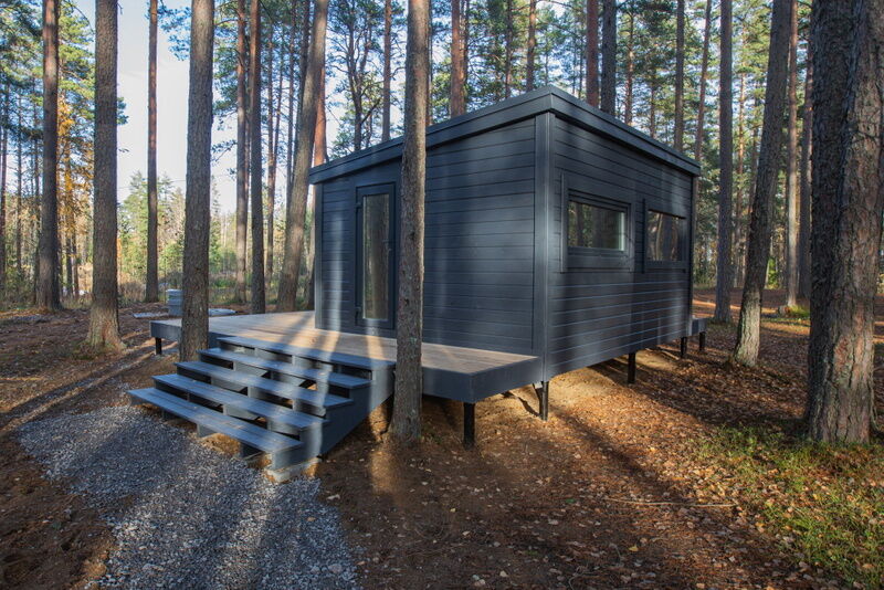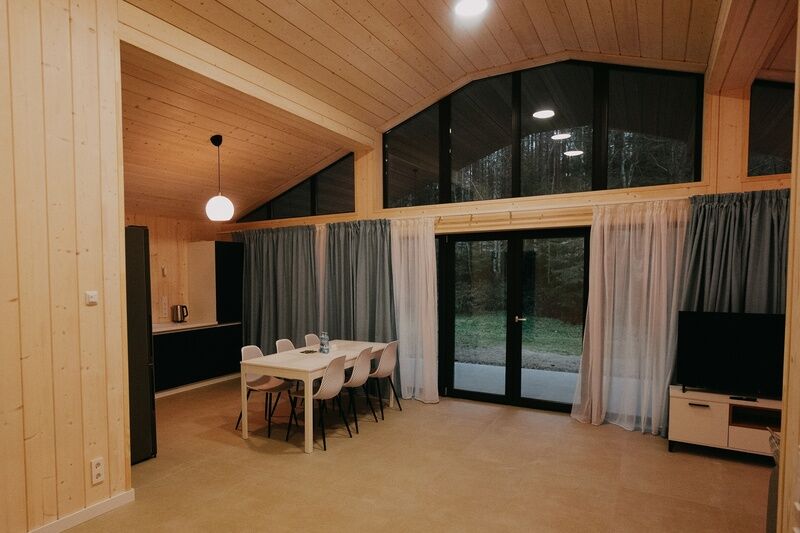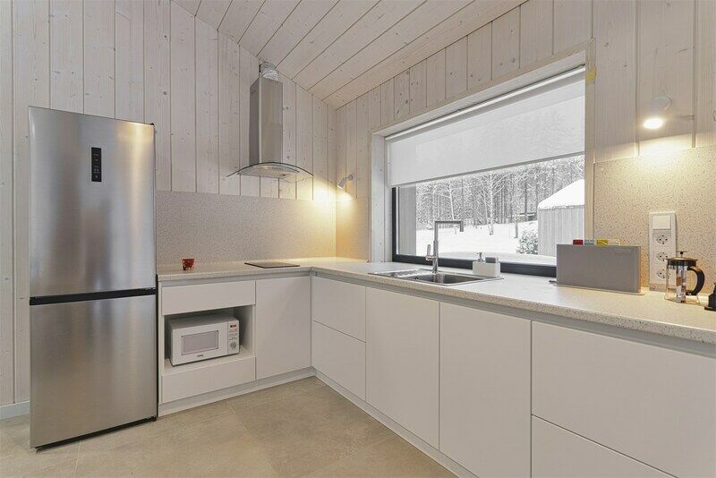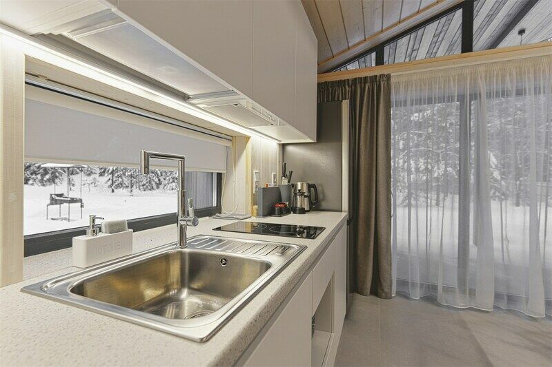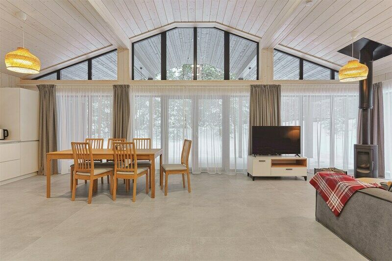 Через панорамные окна открывается потрясающий вид на лес Карельского перешейка. Дом рассчитан на 4 (+2) человек, две спальни и большая кухня-гостиная.