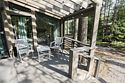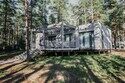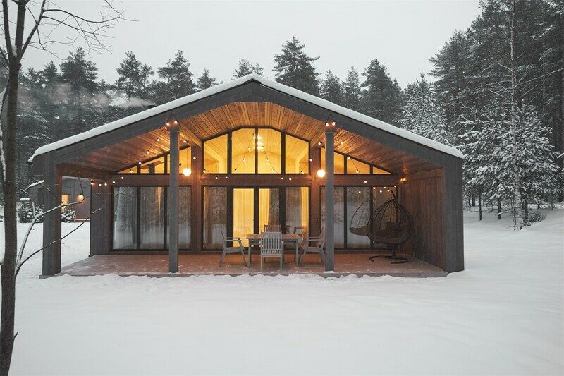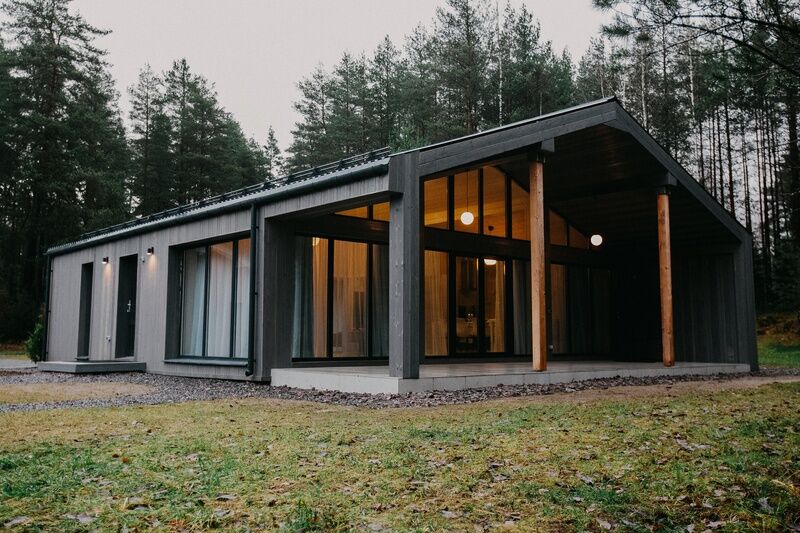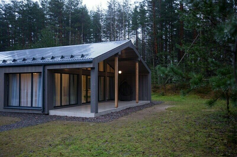 Cтильный дом в сосновом лесу, с панорамными окнами и крытой террасой.