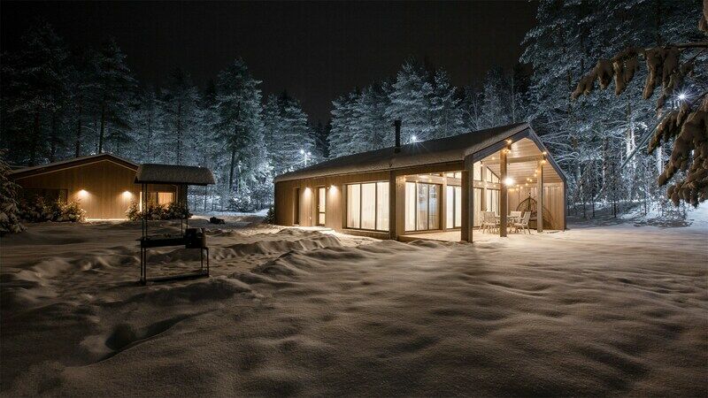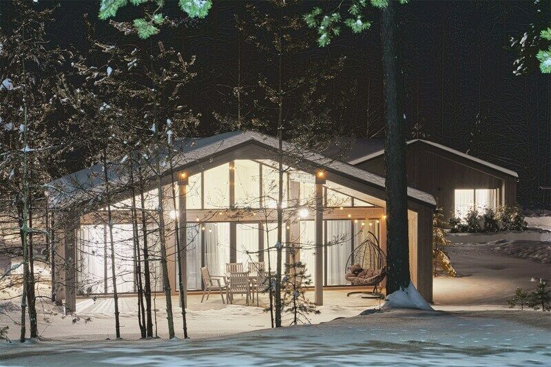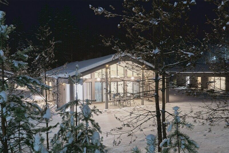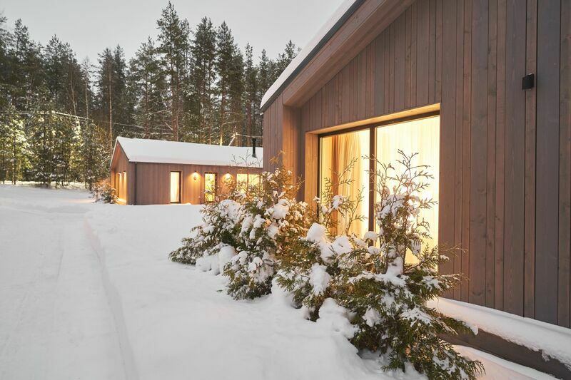 У дома — панорамное остекление с видом на лес Карельского перешейка.