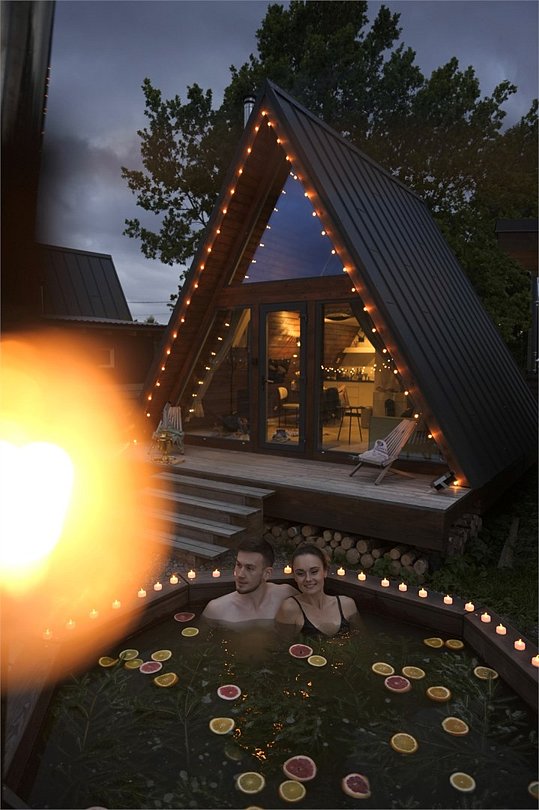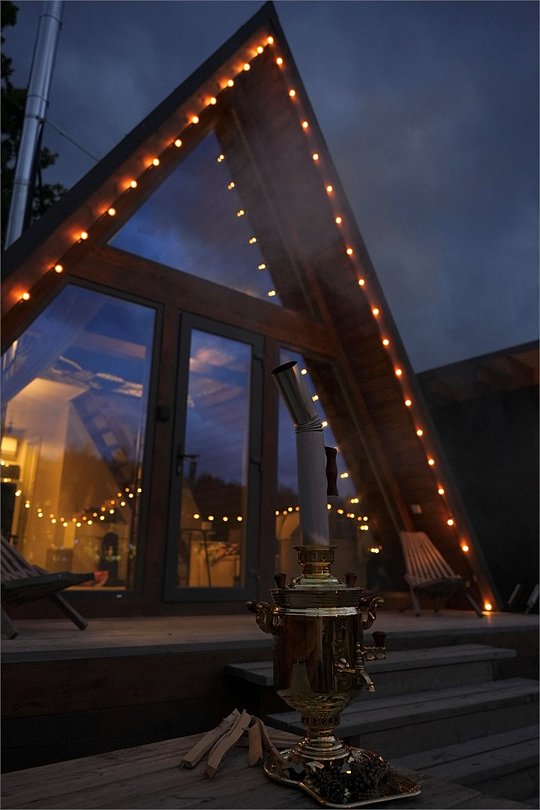 Дома категории «Golden» — наши самые уединенные дома благодаря огороженной территории. В каждом из них вас ждет окружение сосен, елей. Благодаря ограждению, дома будут особенно актуальны для родителей с маленькими детьми и активными питомцами. ТИП РАЗМЕЩЕНИЯ: «Golden» рассчитан до 4 человек и имеет 2 спальных места. Дом двухэтажный площадью 55 кв.м. ЧТО НАХОДИТСЯ НА ТЕРРИТОРИИ ДОМА: • Банный чан под открытым небом. К нему мы предлагаем самый большой выбор наполнений: еловые и фруктовые, с просекко и фруктами для двоих, с игрушками и многие другие виды наполнений. Стоимость банного чана и подробную информацию смотрите на сайте на странице «банный чан». • Баня. Дополнительно к проживанию мы предлагаем не только банный чан, но и баню, которая находится на территории дома. • Мангальная и обеденная зоны. К мангалу идут бесплатно шампура. Дрова, угли и розжиг вы можете приобрести на месте. ДЛЯ ДЕТЕЙ В ДОМЕ: • Кроватка-манеж и стульчик для кормления (бесплатно по запросу) • Защитная сетка-гамак около лестницы на втором этаже ОРГАНИЗАЦИЯ ПИТАНИЯ: • Все наши дома полностью оснащены для самостоятельного приготовления еды. Также, вы можете заказать вкусные блюда с нашей кухни, которые мы доставим прямо к вашей двери или в летнее кафе. Для выбора завтрака, обеда или ужина просто отсканируйте QR-код в вашем доме. Меню дополнительно размещено на территории летнего кафе и на сайте. • А еще, в 6 км от нас находятся «Пятёрочка». РАЗМЕЩЕНИЕ С ЖИВОТНЫМИ: На нашей базе отдыха разрешено со своими четвероногими друзьями, поэтому обязательно берите их тоже! Подробные условия и стоимость проживания с питомцами переходите читать на сайте или уточняйте у менеджера отдела бронирования . А также: мы круто украшаем дома ко дню рождению, по романтическому поводу и девичнику. У нас есть программы парения, услуги массажиста и и различные доп.программы (подробнее переходите читать на сайте или уточняйте у менеджера отдела бронирования). Заезд и выезд бесконтактный.Услуги и удобства