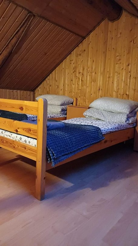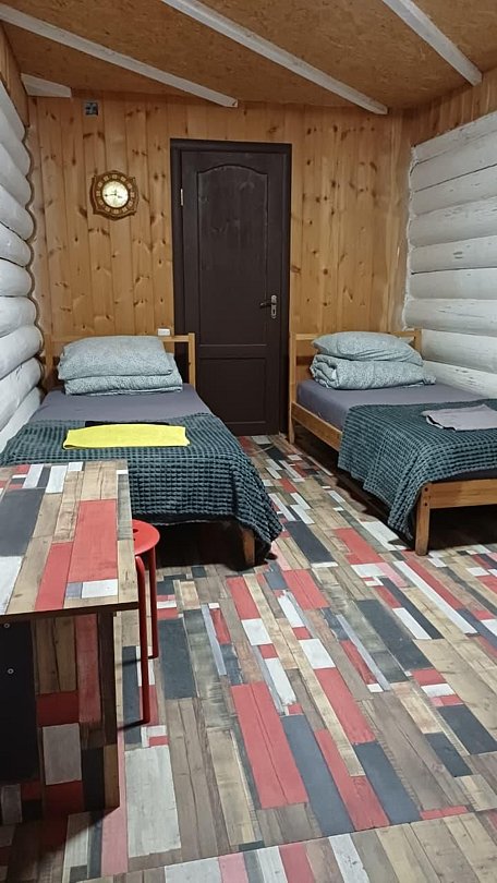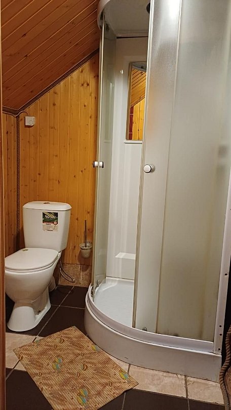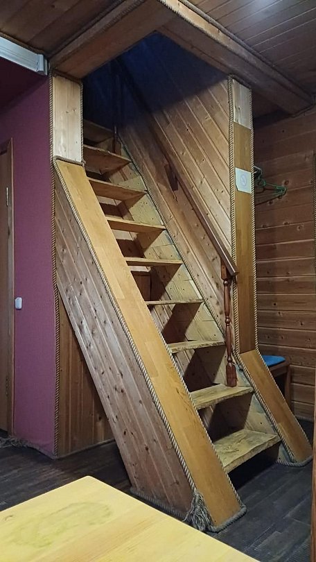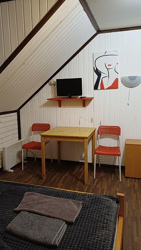 Это просторный двухуровневый номер, комфортное размещение для 4-х человек. Красивый вид из окна на реку. Первый этаж: 1 двуспальная кровать, телевизор, ванная комната. Второй этаж: мансарда, 2 раздельные кровати.