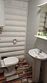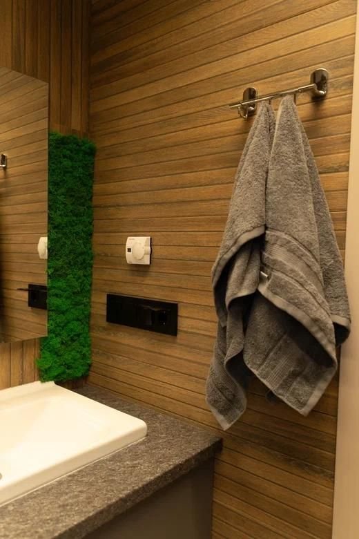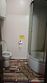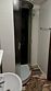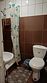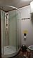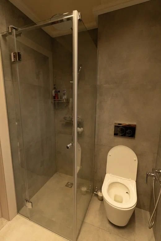 Современная ванная комната: санузел с душевой кабиной, стиральная машина, полотенца, набор косметических принадлежностей.