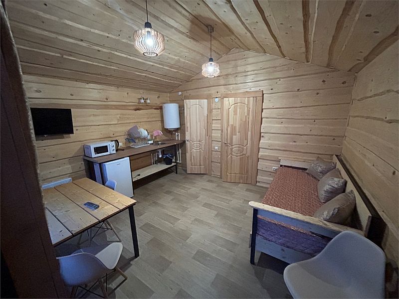 Светлая гостиная в русском стиле, с кухонной зоной. Есть кухонный гарнитур, микроволновая печь, чайник, холодильник. В гостиной TV, WI-FI. Ванная комната с душевой кабиной и автономным подогревом горячей воды.