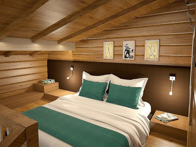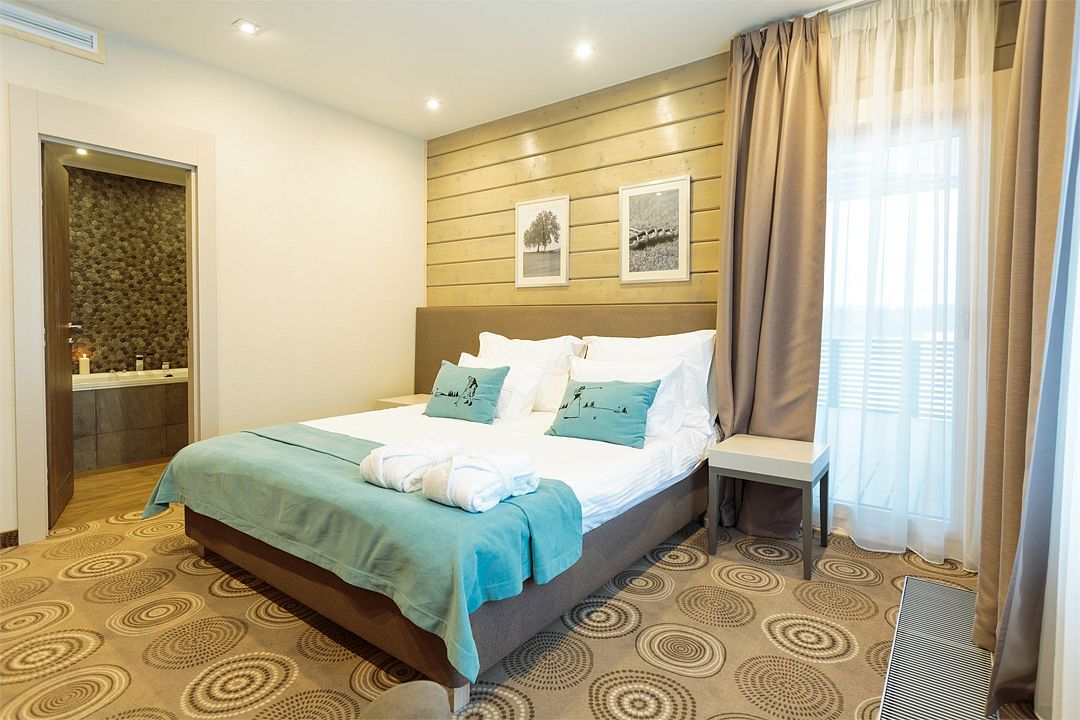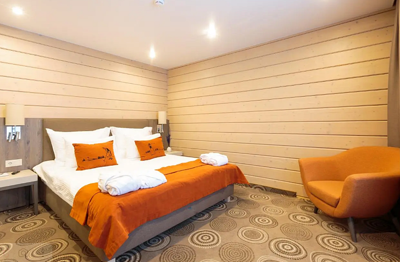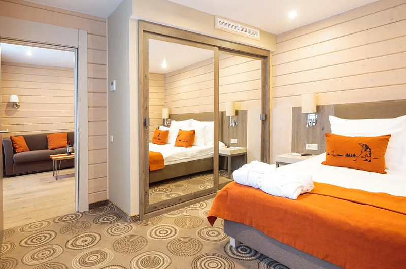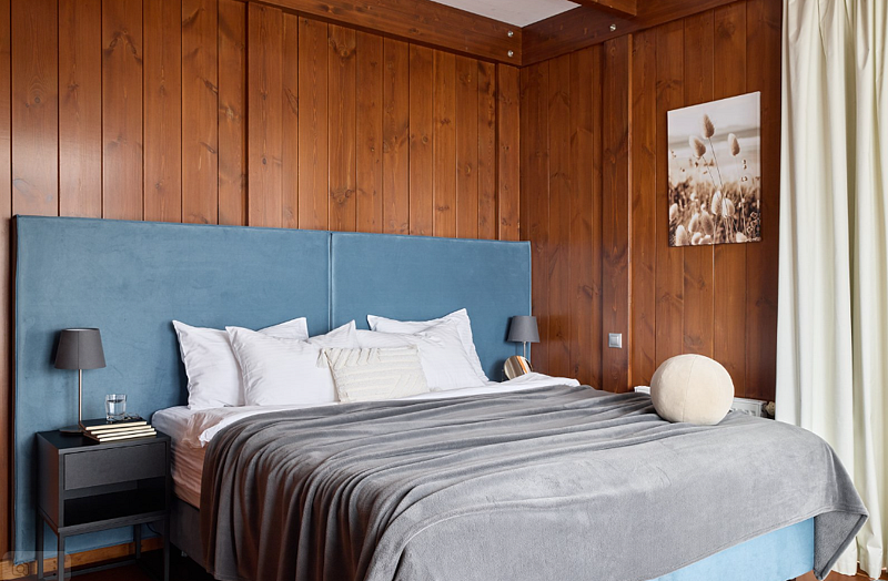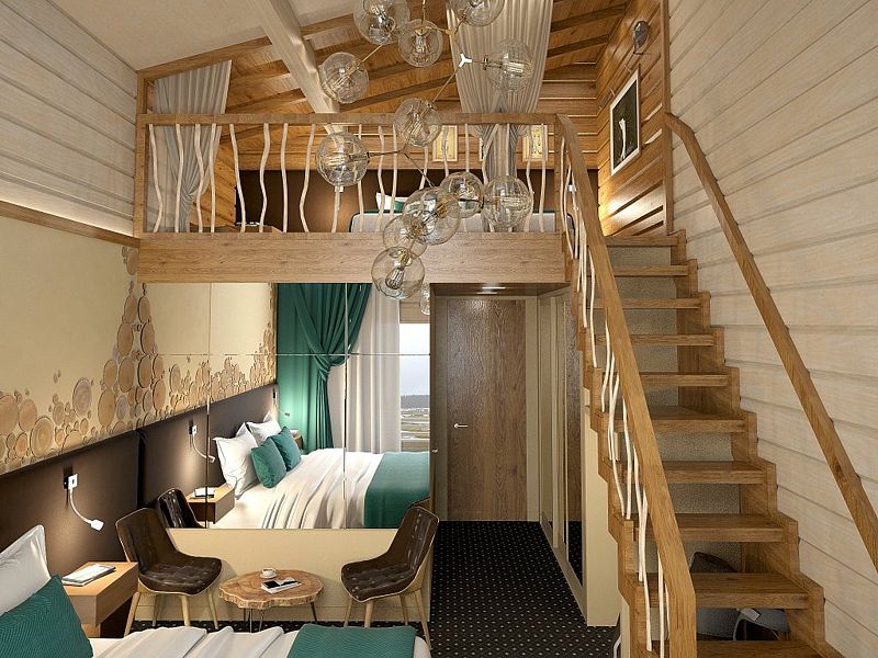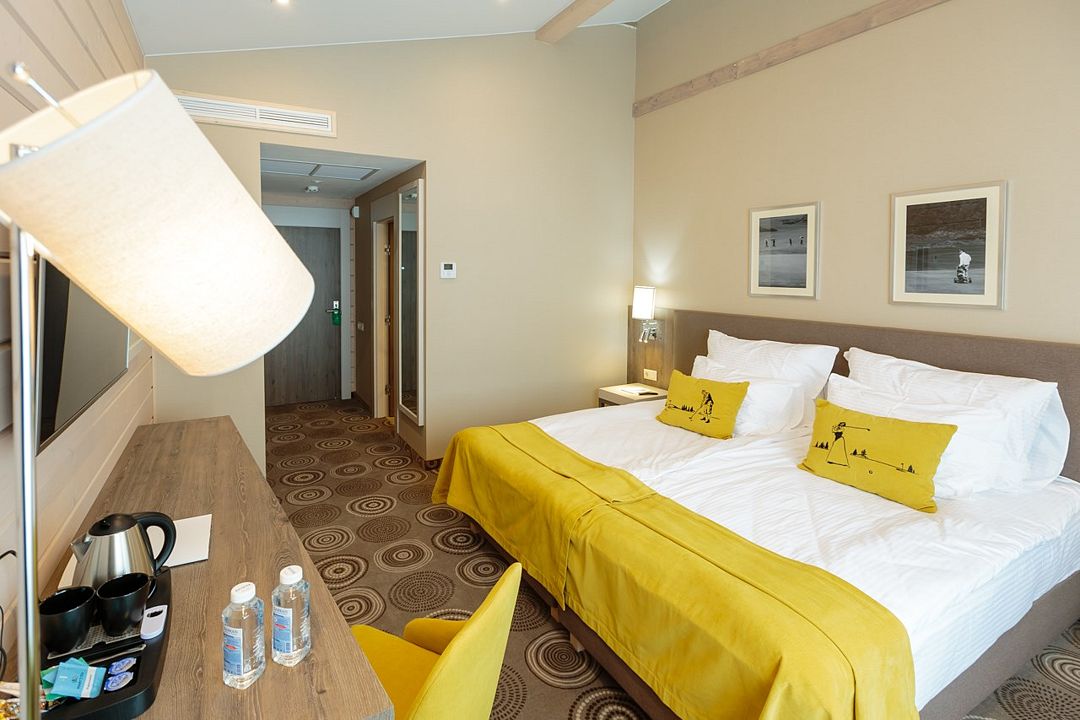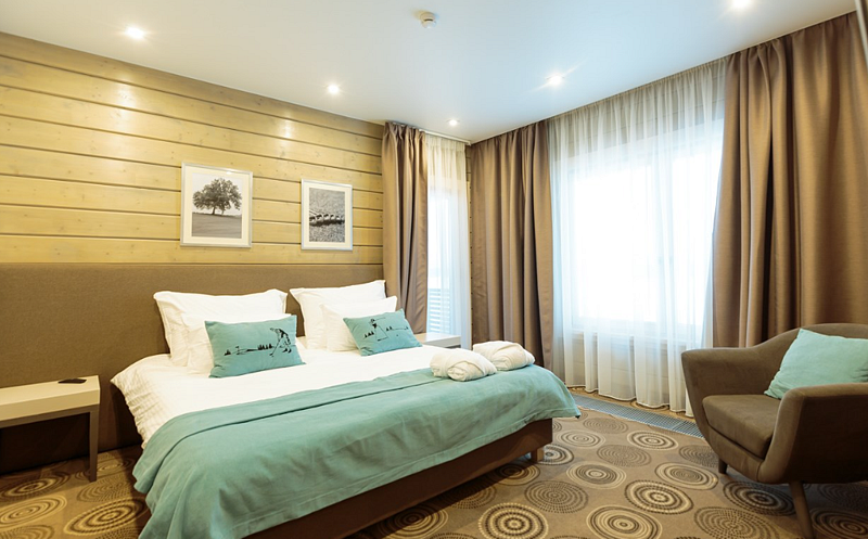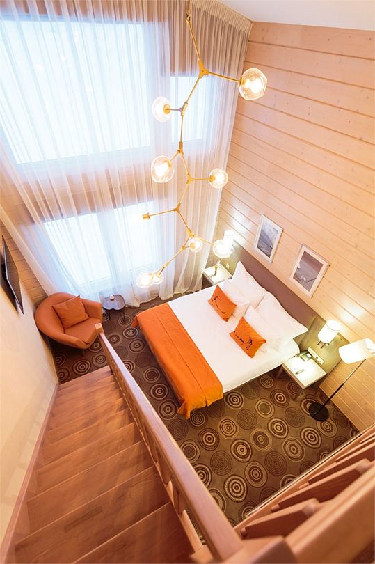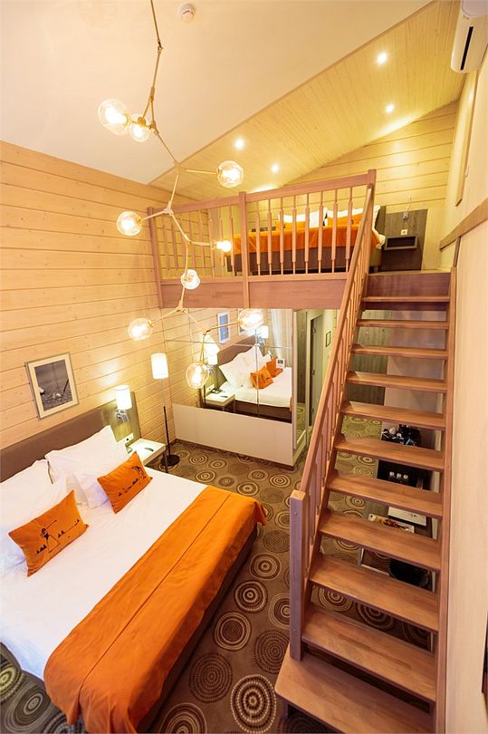 Уютный двухэтажный номер, где каждая деталь продумана для вашего комфорта. Большие окна наполняют комнату мягким естественным светом, где центральное место занимает просторная, удобная кровать с яркими декоративными акцентами. Удобная лестница ведет на второй уровень, где вас ждет дополнительное пространство для отдыха и уединения. Светильники с современным дизайном добавляют особый шарм и делают освещение мягким и расслабляющим. Оснащение номера: - Двуспальная кровать - Дополнительное спальное место на втором уровне с двуспальной кроватью - Кондиционер - Большие окна с видом на гольф-поле - Современные дизайнерские светильники Идеальный номер для семьи с детьми.Услуги и удобства