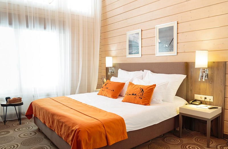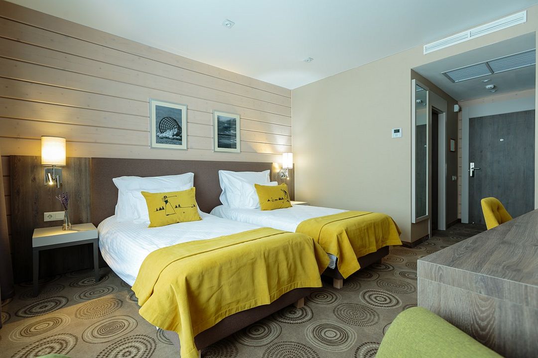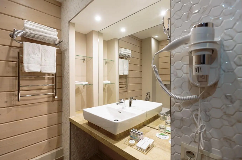 спутниковое телевидение, Wi-Fi, кондиционер, светильник, настольные лампы, фен, электронные замки, душевая кабина, теплый пол, банные полотенца, тапочки, косметические средства, две односпальные или большая двуспальная кровать, шкаф для одежды, вешалки, журнальный столик, багажная тумба, зеркало, сейф, унитаз, раковина, кресло, стол, туалетные средства, внутренний телефон, телевизор с плоским экраном, мини-холодильник, гостиничная парфюмерия, можно с питомцамиВ гостиничном номере