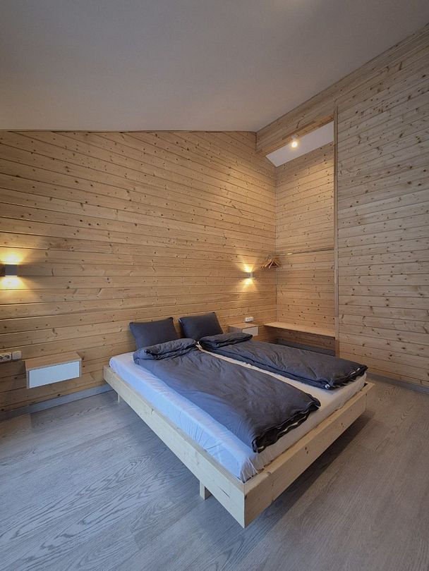 В домике есть всё необходимое для комфортного проживания. Открывается вид на горные курорты и лес.