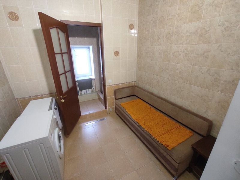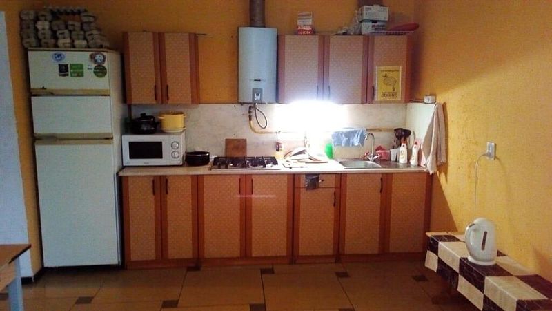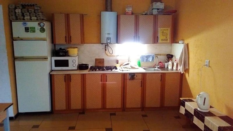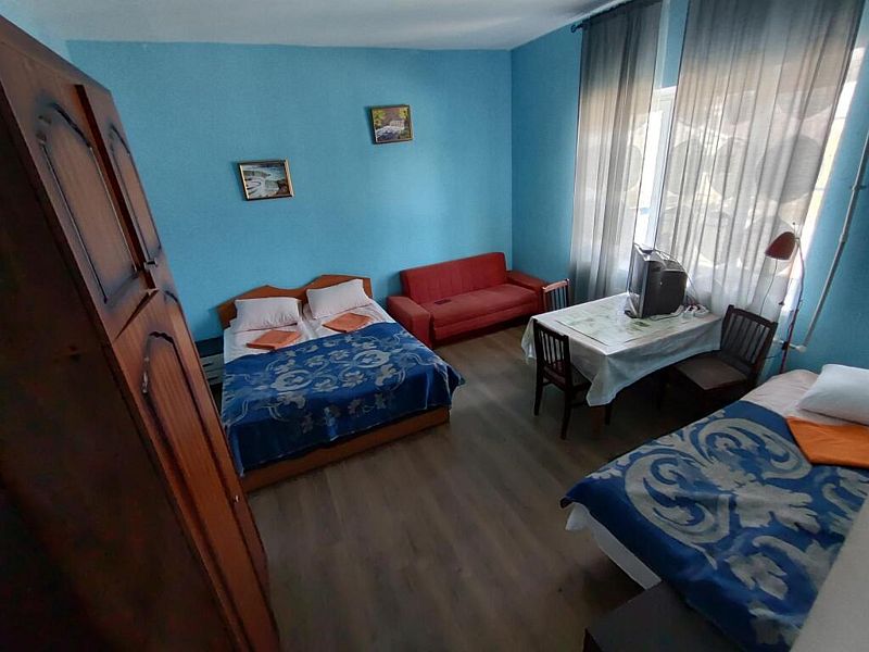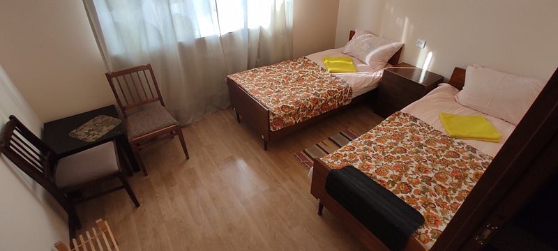 Просторная комната с большим окном в двухэтажном частном доме, с одной двуспальной кроватью и односпальной тахтой и двуспальным раскладным диваном. В еомнате полным набором постельных принадлежностей с полотенцами и ковриками. Среди обстановки также имеется телевизор, шкаф для вещей, стол, стулья, тумбочки и большое зеркало. Выход в общую гостиную. Общая кухня с телевизором, оборудованием и принадлежностями для приготовления и хранения продуктов. Главный санузел (туалет с доступом для лиц ограниченной подвижности и инвалидов, 2 отдельные душевые, 3 умывальника). В доме горячая и питьевая вода из крана (собственная скважина). Отопление от газового котла. В комнатах дополнительно (выдаются по необходимости): электрообогреватели и вентиляторы. Качественный Wi-Fi. Электрочайник и электроудлиннитель.