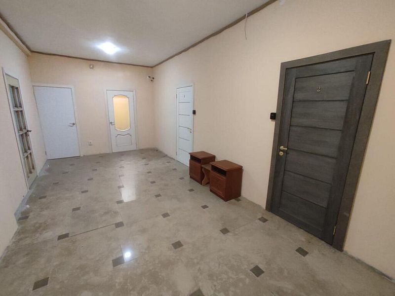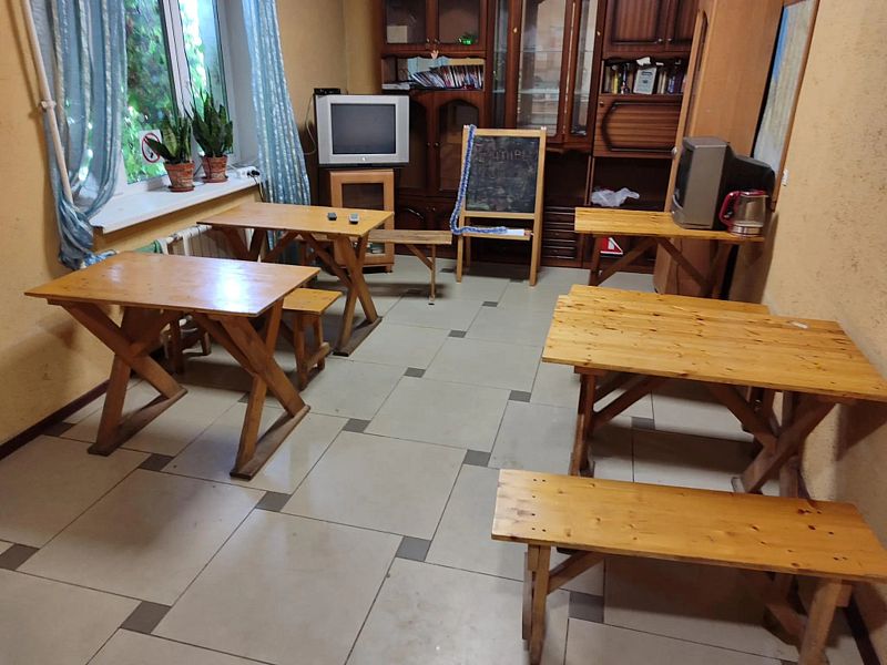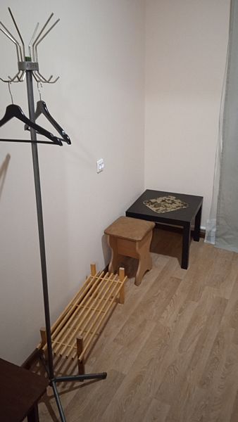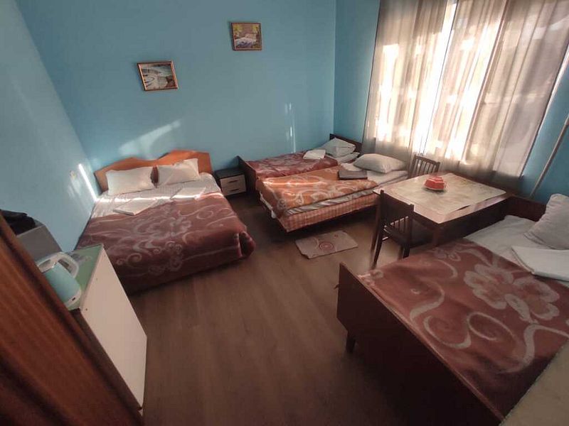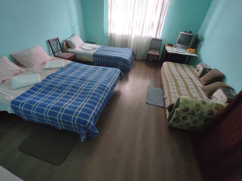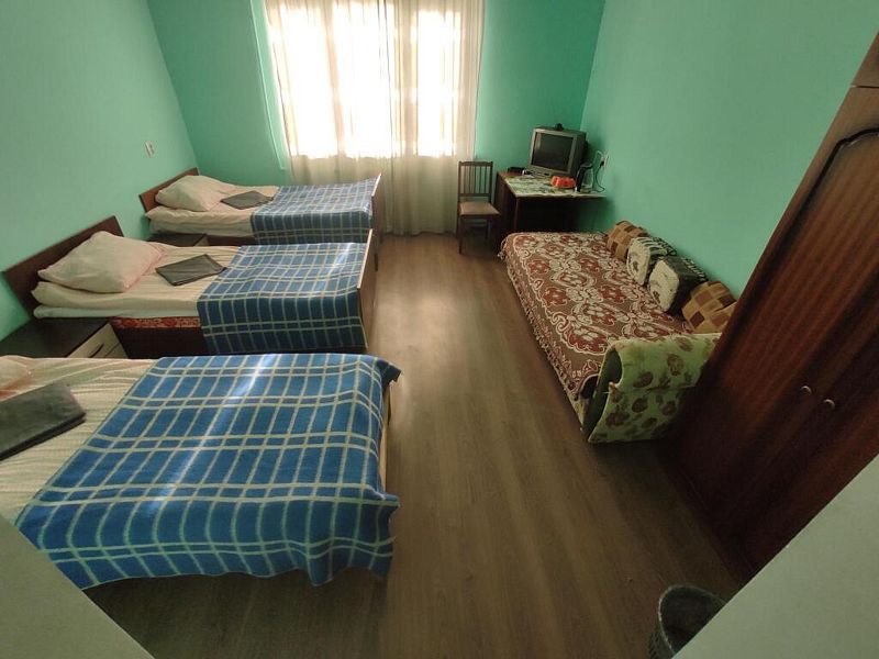 Просторная минималистичная комната с окном, с тремя односпальными кроватями с полным набором принадлежностей и прикроватными ковриками, и односпальной тахтой с подушками. Имеется телевизор на столике, стулья. Выход в общую гостиную. На этаже общие главный санузел: туалет с доступом для лиц ограниченной подвижности, 2 отдельные душевые кабинки, 3 умывальника. Общая кухня телевизором со всем необходимым для приготовления и хранения пищи. Удобный выход через холл на террасу. Оборудование комнаты: телевизор, обогреватель, вентилятор, электрочайник, электроудлиннитель, шкаф для вещей, корзина для мусора. Прекрасный Wi-Fi.