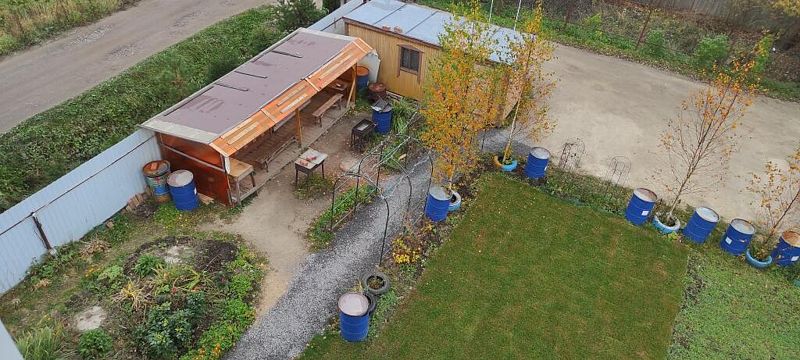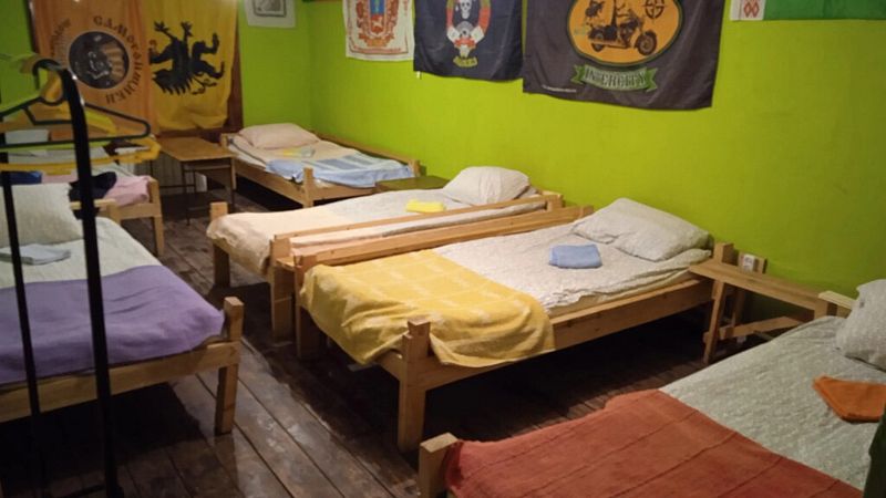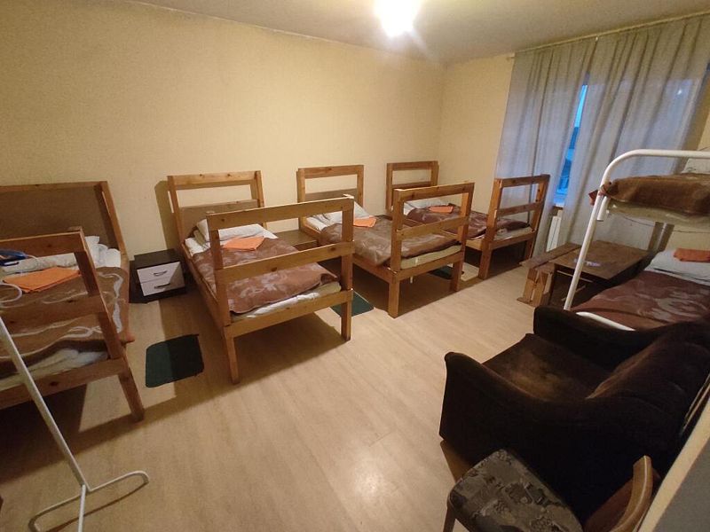 Большая минималистичная комната на 2 этаже двухэтажного дома с большим окном, видом на парк и внутренний двор. В комнате имеются 5 односпальных кроватей и 1 раскладное кресло с постельным бельем, банным полотенцем и прикроватными ковриками. Также среди остановки имеются шкаф, стол, тумбочки, стулья, табуретки.