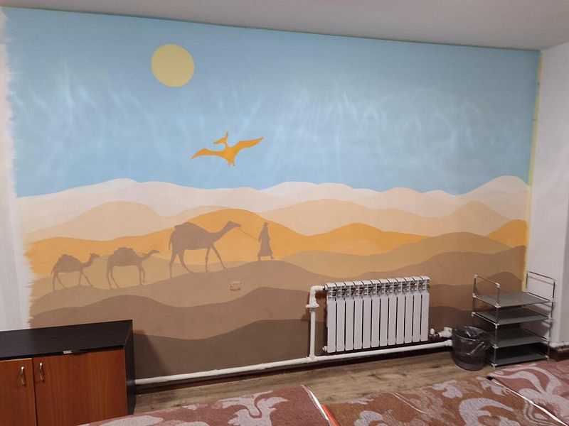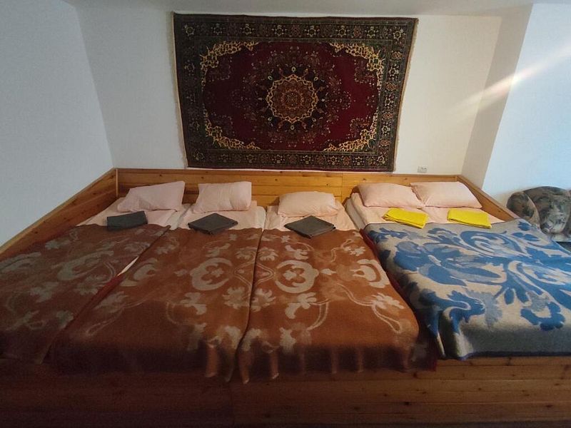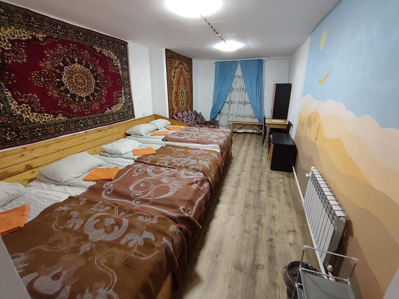 Большая светлая комната для семьи с детьми или группы друзей . Единая кровать Турист-Кинг-Сайз на 5–6 мест, со всеми необходимыми спальными принадлежностями. Также в комнате есть двуспальный раскладной диван, стол, стулья, шкаф для вещей. Пространство выдержано в восточном стиле: стены украшены коврами. Одна стена декорирована в стиле пустыни. Выход на главную лестницу. Общая кухня с общим телевизором, с оборудованием и принадлежностями для приготовления и хранения продуктов и большой санузел (туалет с доступом для лиц ограниченной подвижности и инвалидов, 2 отдельные душевые, 2 умывальника) размещаются на 1 этаже. В доме горячая и питьевая вода из крана (собственная скважина). Отопление от газового котла. В комнатах дополнительно (выдаются по необходимости): электрообогреватели и вентиляторы. Качественный Wi-Fi.