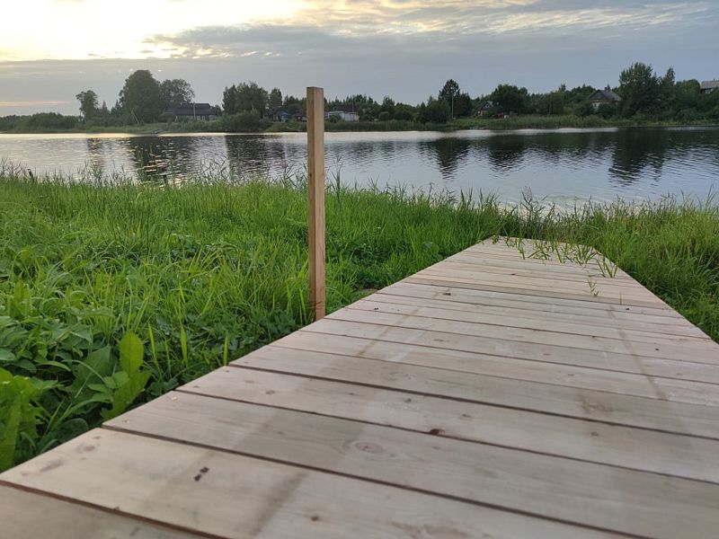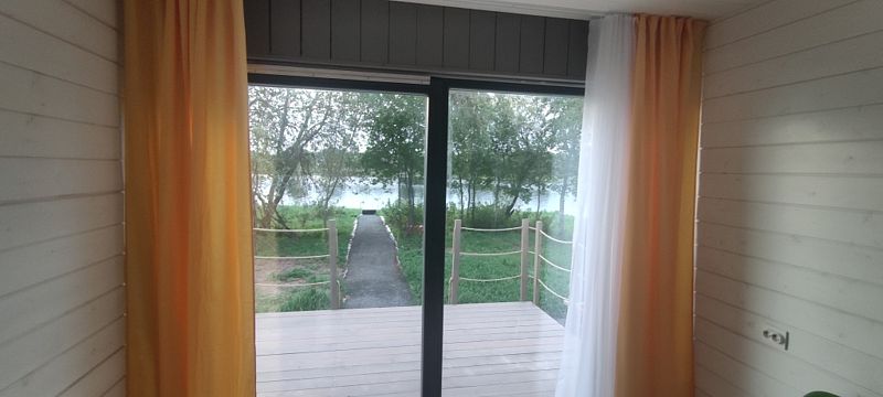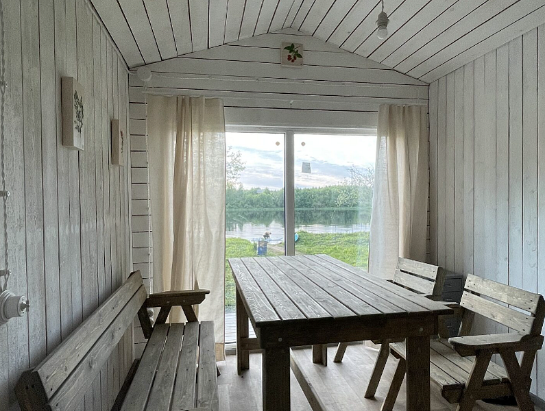 Дом с двухспальной кроватью, удобным диваном на двоих. Свой пирс на берегу реки, своя зона барбекю.