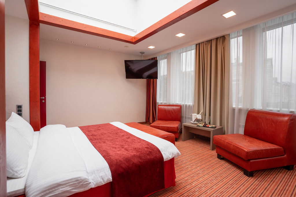«Панорамный Люкс» – настоящая «звезда» Red Stars Hotel. Его ключевой особенностью является стеклянный купол над кроватью, через который вы сможете насладиться панорамой петербургского неба (по желанию гостей данный купол можно закрыть светонепроницаемой шторой с помощью пульта управления). Это просторный стильный номер общей площадью 45 м2 с панорамными окнами, выходящими на набережную. Подходит для размещения до трёх гостей. Номер оснащён комфортной лаунж-зоной, чайной станцией, кондиционером, сейфом, питьевой водой, а просторная ванная комната – полами с подогревом, косметическими принадлежностями, халатами и тапочками. Согласно Постановлению Правительства Санкт-Петербурга от 03.09.2014 № 837 с 1 ноября 2022 года пользование общегородской парковкой по периметру отеля платное. Во дворе отеля имеется бесплатная парковка по предварительной резервации, количество мест ограничено. Для уточнения наличия свободного места и бронирования, пожалуйста, свяжитесь напрямую с отелем.Услуги и удобства