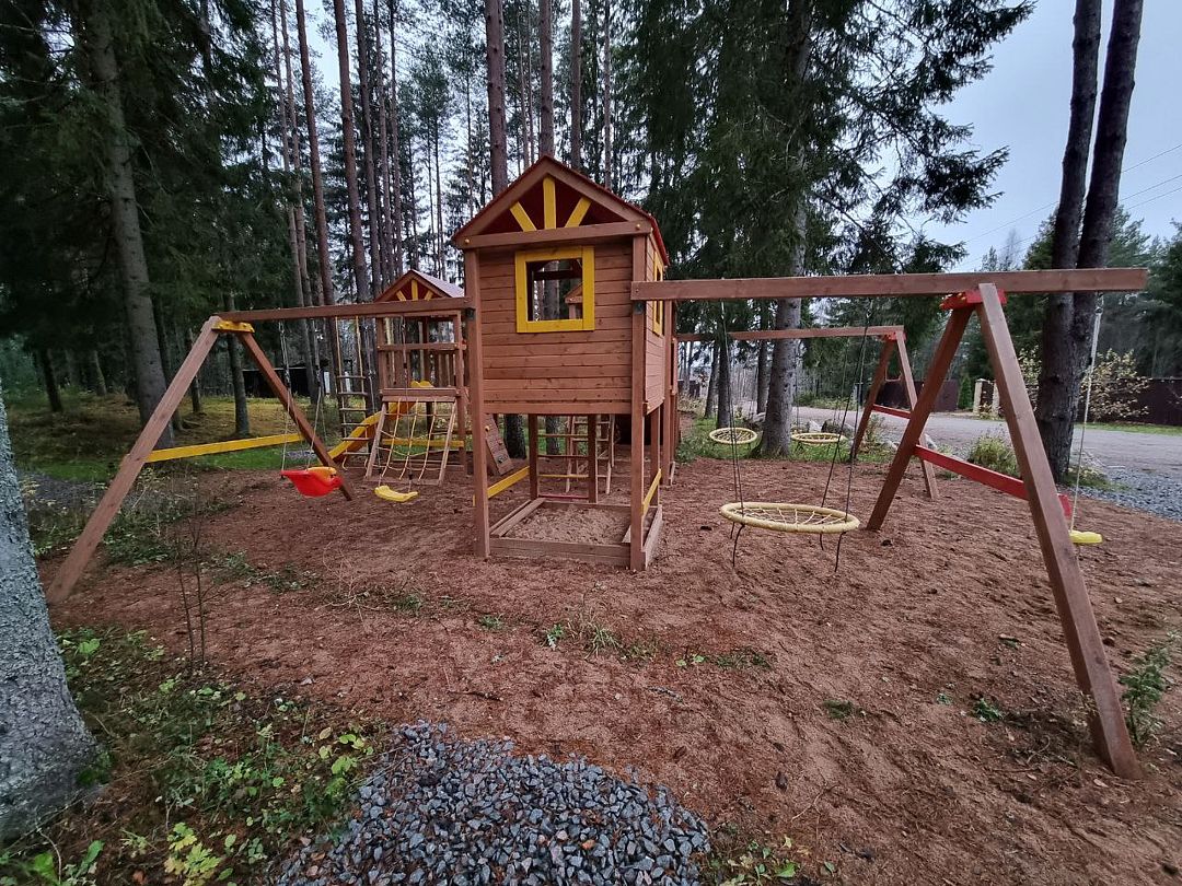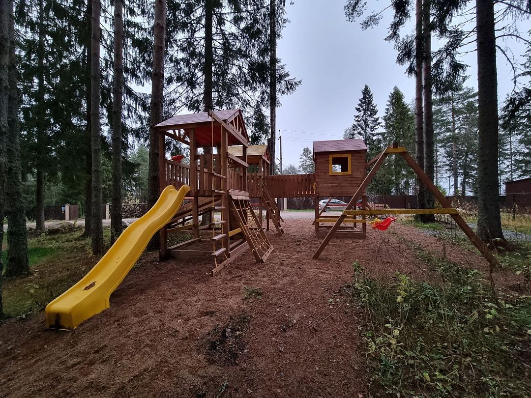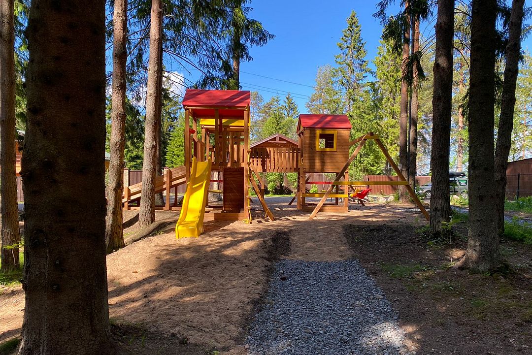 Детский игровой городок с горками на территории.