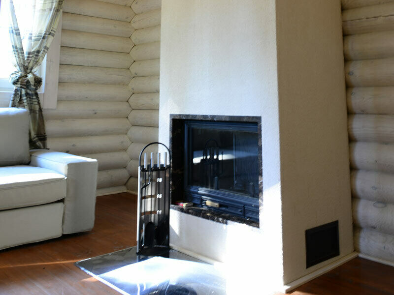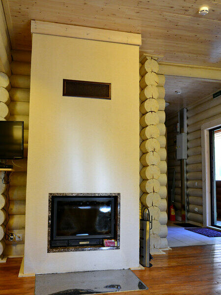 - просторная гостиная с камином, разборным диваном и телевизором с DVD;