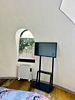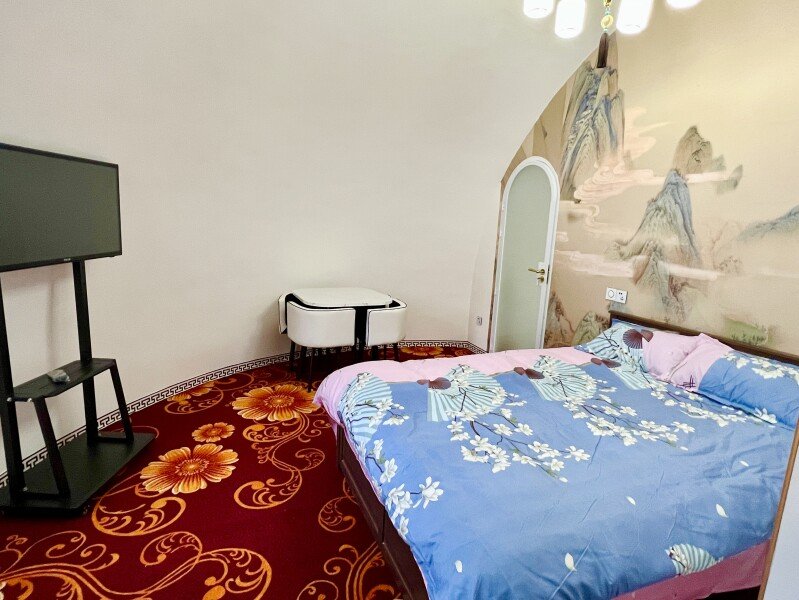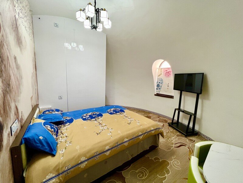 Утопленная гостиная: Гостиная выполнена в инновационном стиле с двумя традиционными китайскими кроватями «архат» (лохань). В центре установлен огромный телевизор шириной два метра со встроенной российской приставкой Sberbox, предоставляющей доступ ко всем российским телеканалам. Это погружает вас в атмосферу личного китайского домашнего кинотеатра.