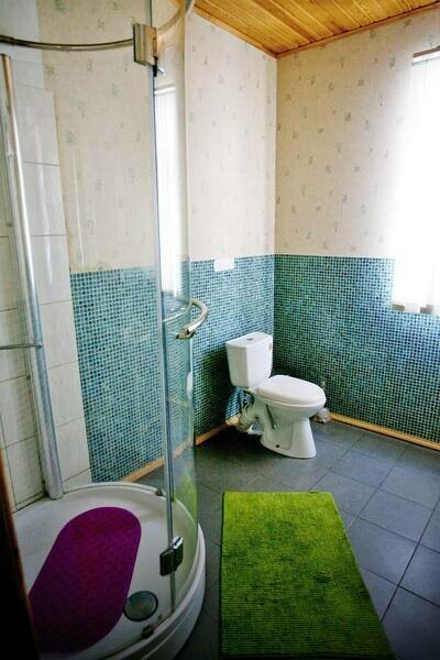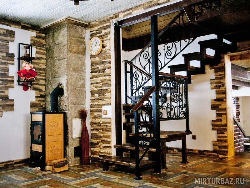 Дом двухэтажный. На первом этаже находится полноценная кухня-гостиная с камином и дополнительным спальным местом, оборудованный душевой кабиной санузел, 1 спальня с двуспальной кроватью. На втором этаже находятся 2 смежные спальни, в каждой спальни двуспальная кровать и односпальная.