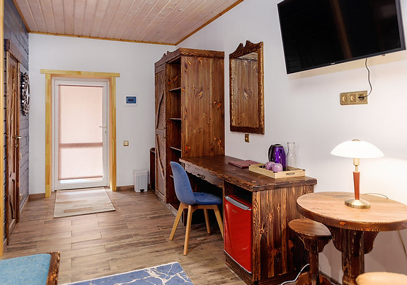 Комфортабельный номер со всеми удобствами. Собственная ванная комната, туалетные принадлежности. В каждом номере терраса с видом на пруды.