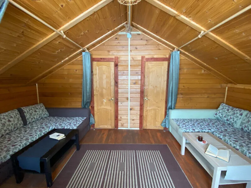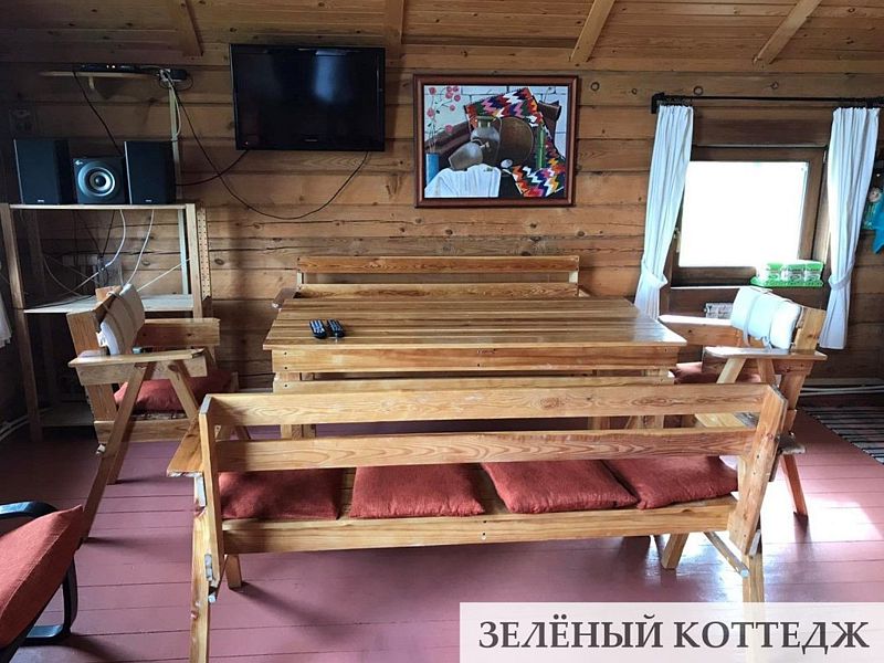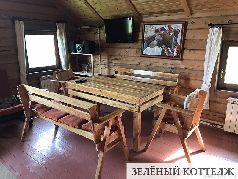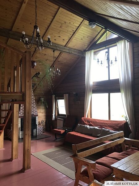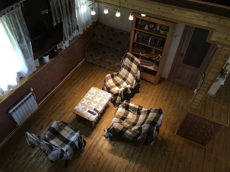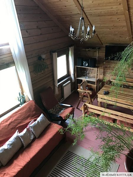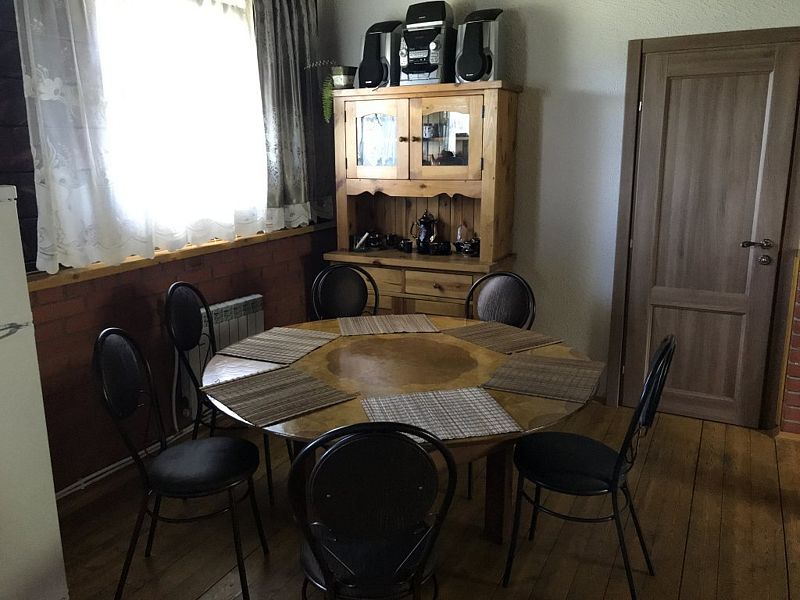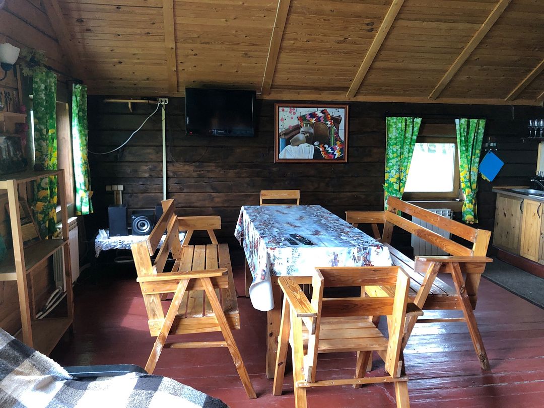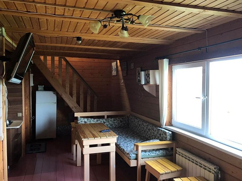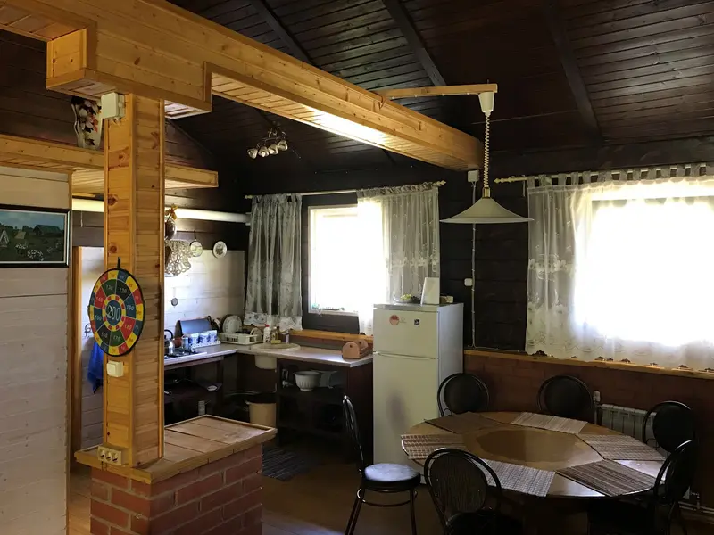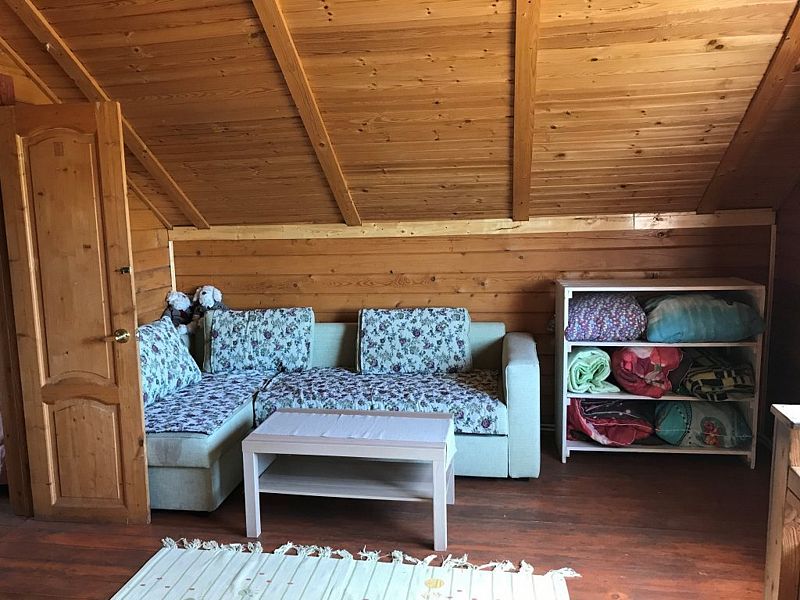 Большой круглый стол, 2 спальни, просторный холл, 7+4 мест, 2018 года постройки, душ, туалет, кухня, холодильник, вся посуда, бельё, уютная мансарда, отопление, рабочее пространство, дополнительные подушки и одеяла, горячая и холодная вода.
