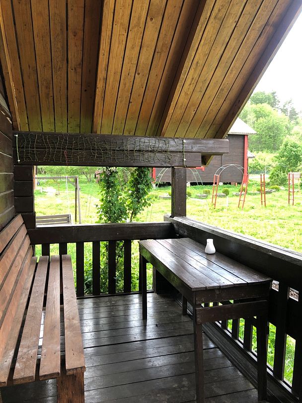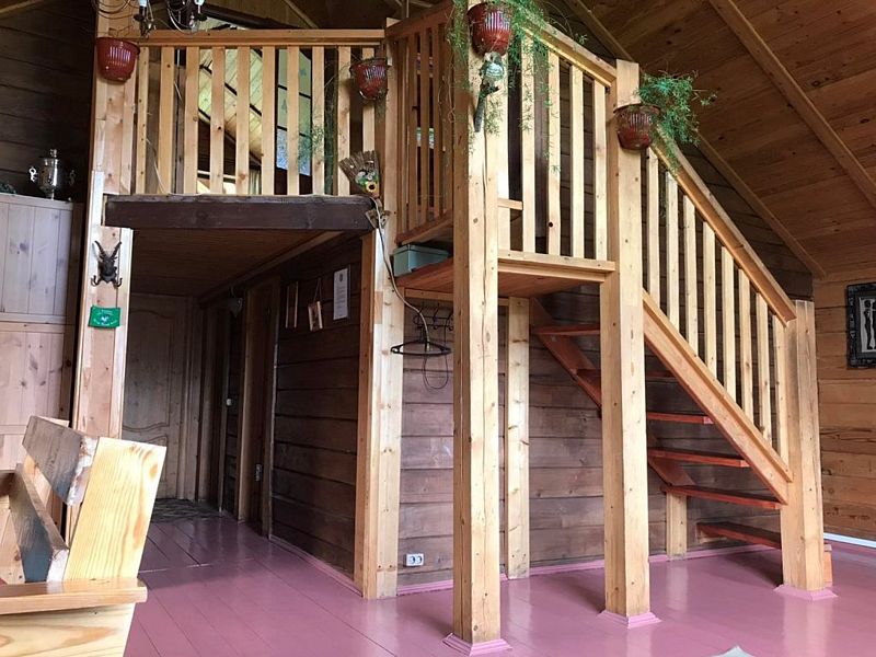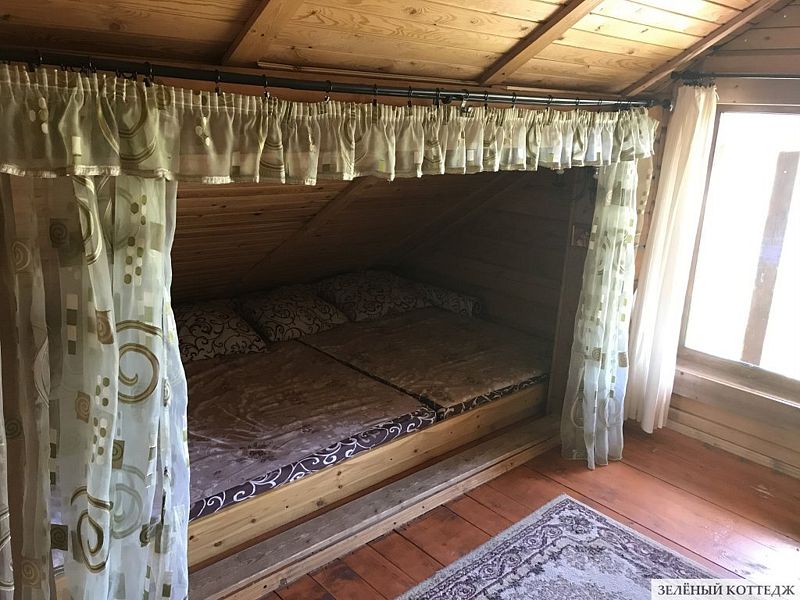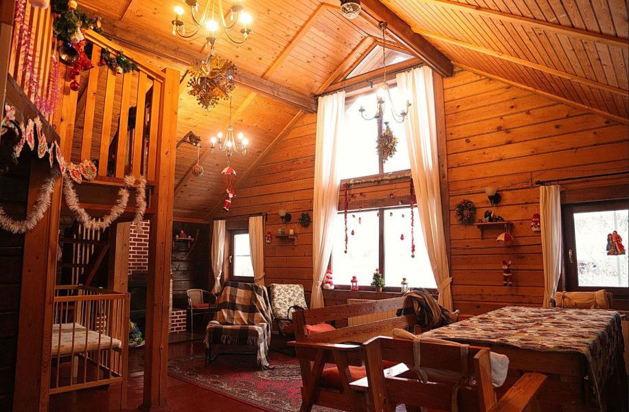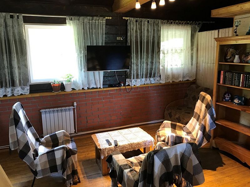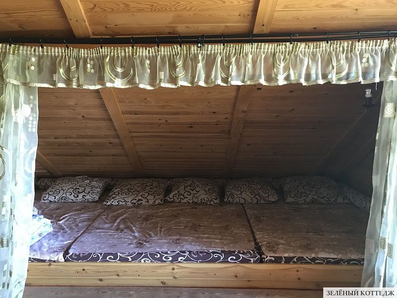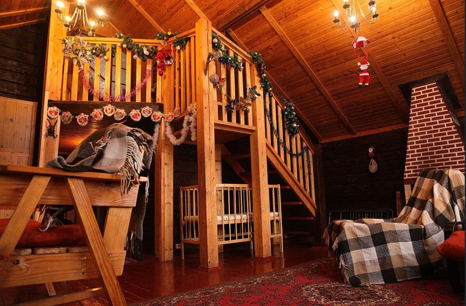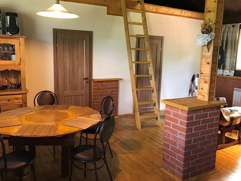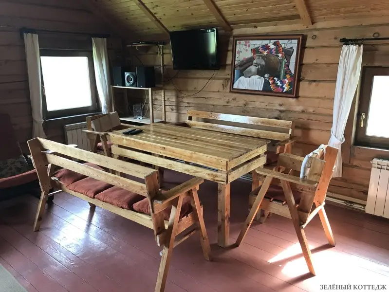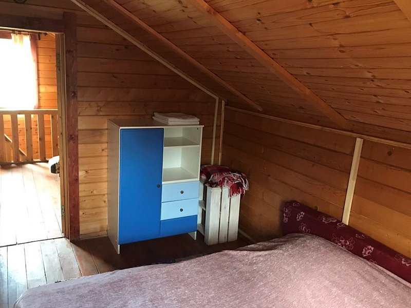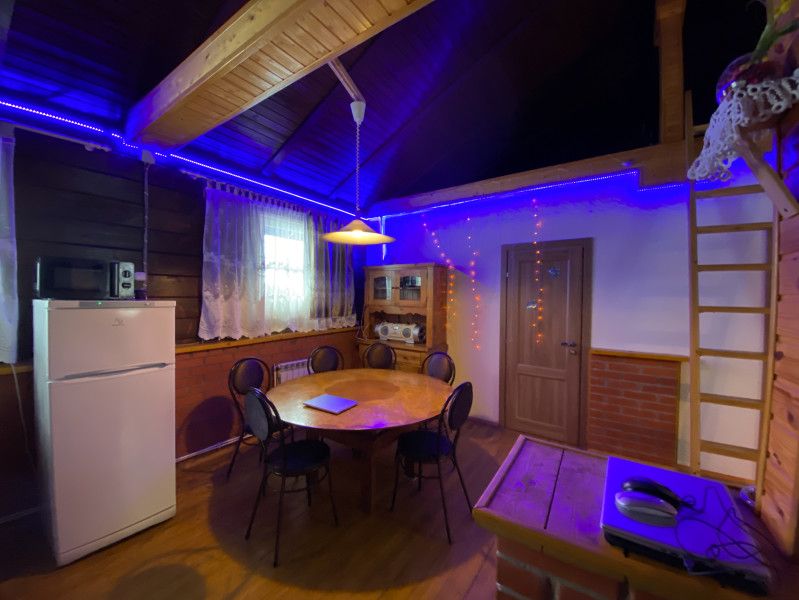 Большой круглый стол, 2 спальни, просторный холл, 7+4 мест, 2018 года постройки, душ, туалет, кухня, холодильник, вся посуда, бельё, уютная мансарда, отопление, рабочее пространство, дополнительные подушки и одеяла, горячая и холодная вода.
