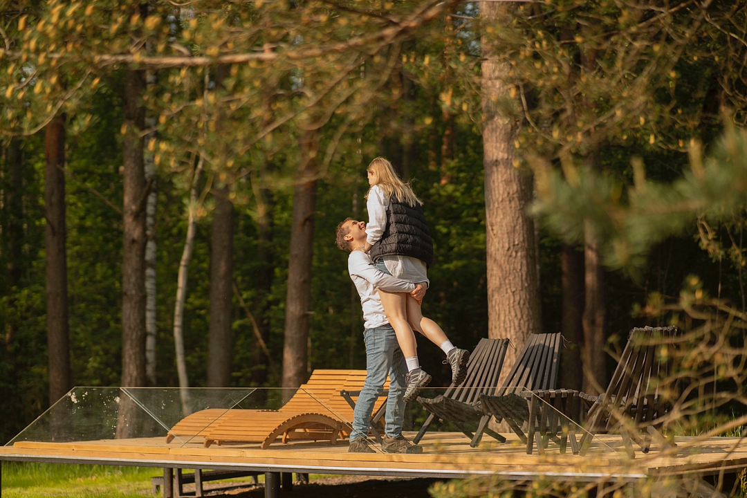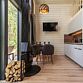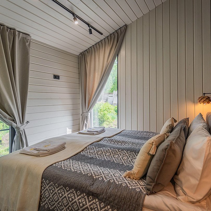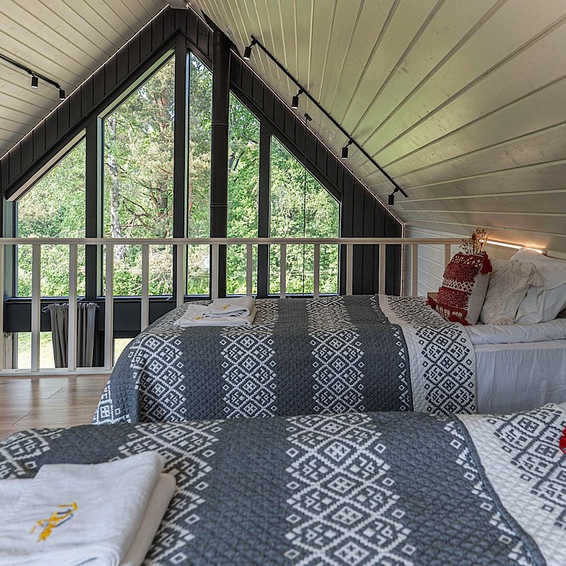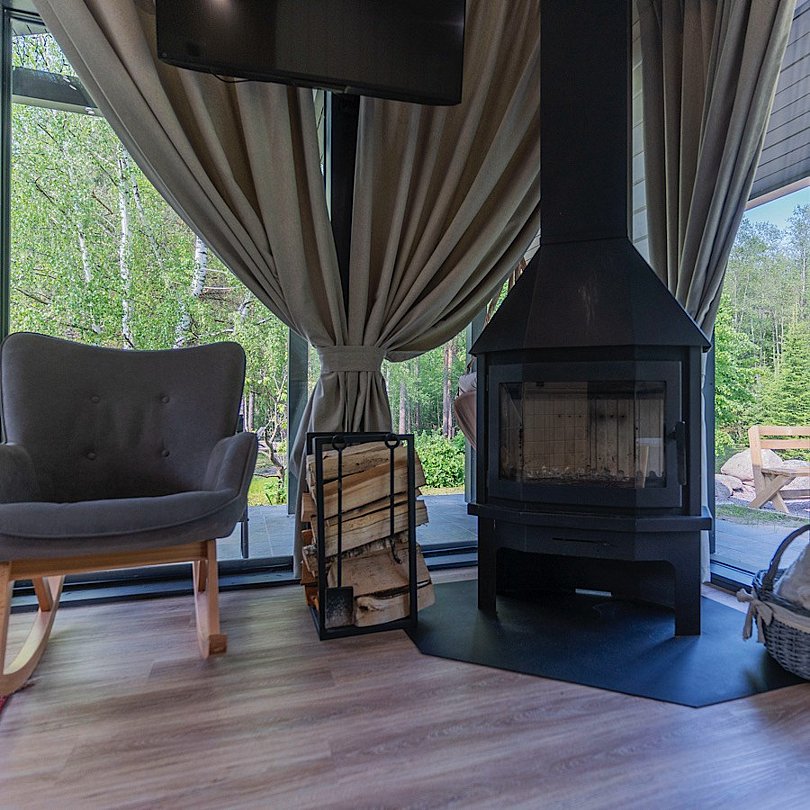 - 2 спальни: одна отдельная на 1 этаже, вторая — открытая с видом на лес;