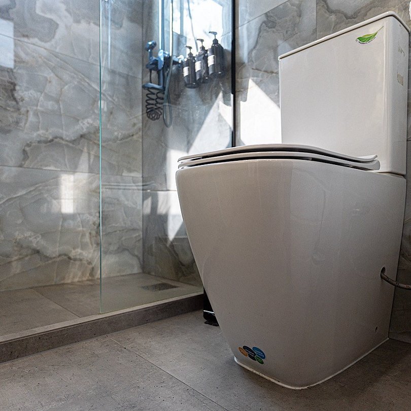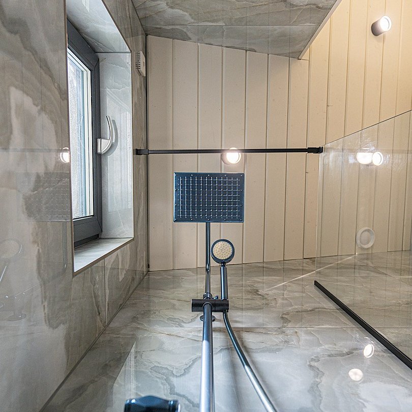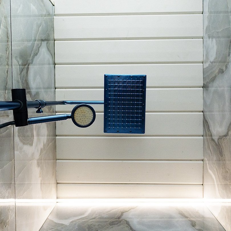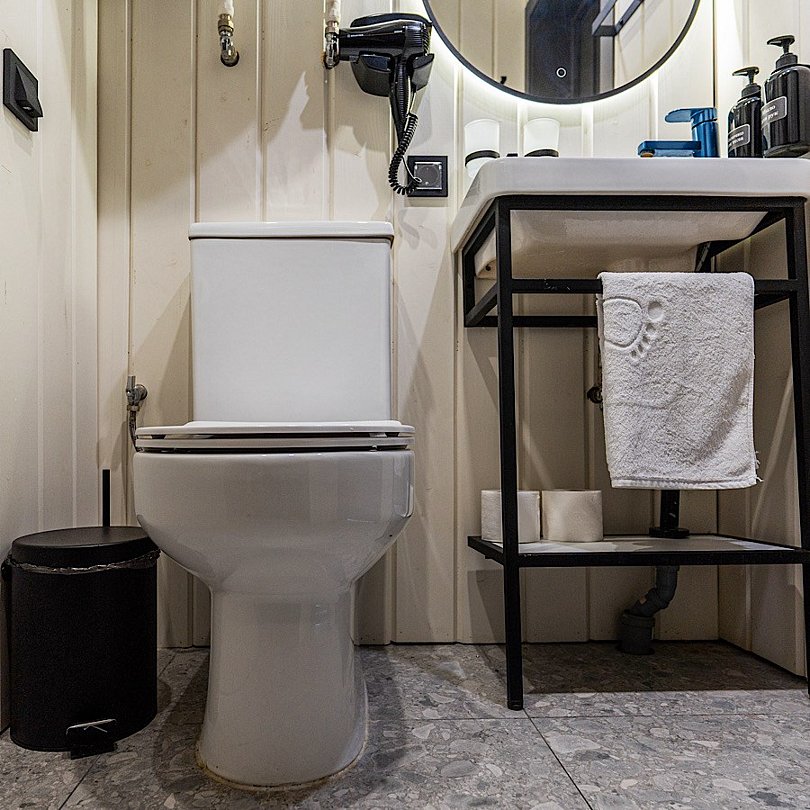 - стильный санузел с подсветкой, феном и душем;