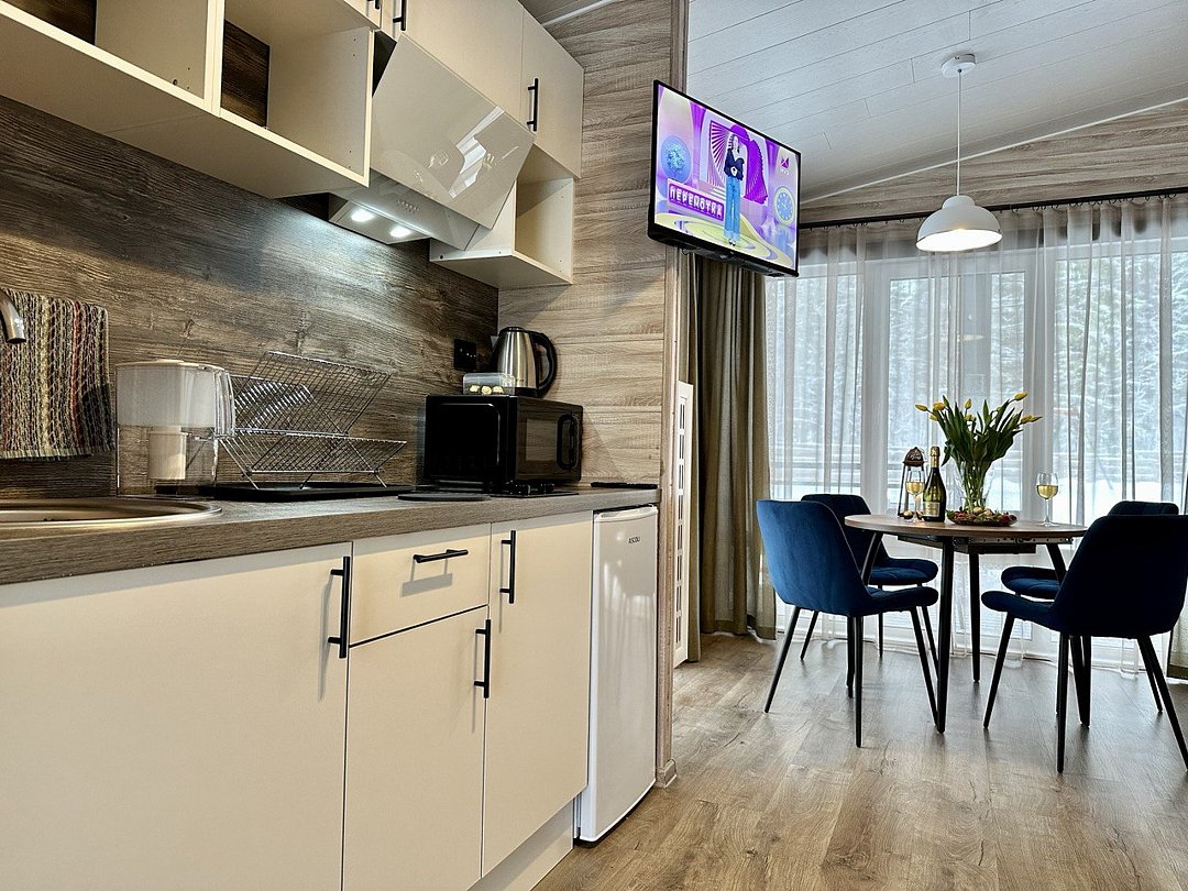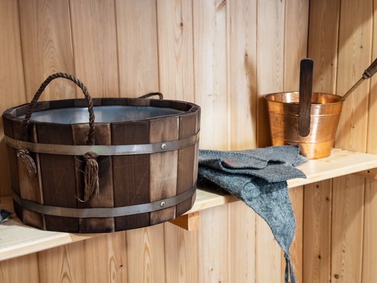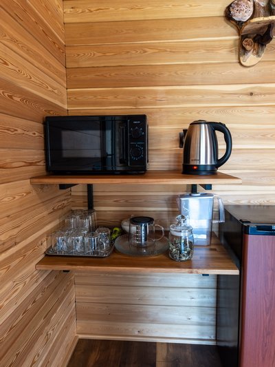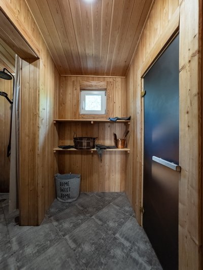 Комплекс оснащен всем необходимым для комфортного пребывания: двумя душевыми кабинами, санузлом, просторной раздевалкой, а также уютной гостиной с панорамными окнами, где гости могут расслабиться, наслаждаясь музыкой или просмотром телевизора. Для удобства посетителей предусмотрен беспроводной интернет, система теплых полов и уличная терраса, идеально подходящая для отдыха на свежем воздухе.