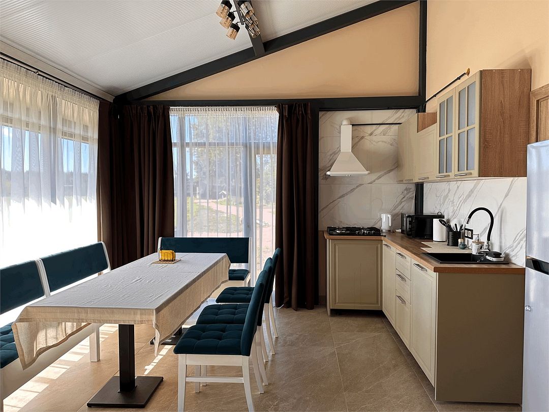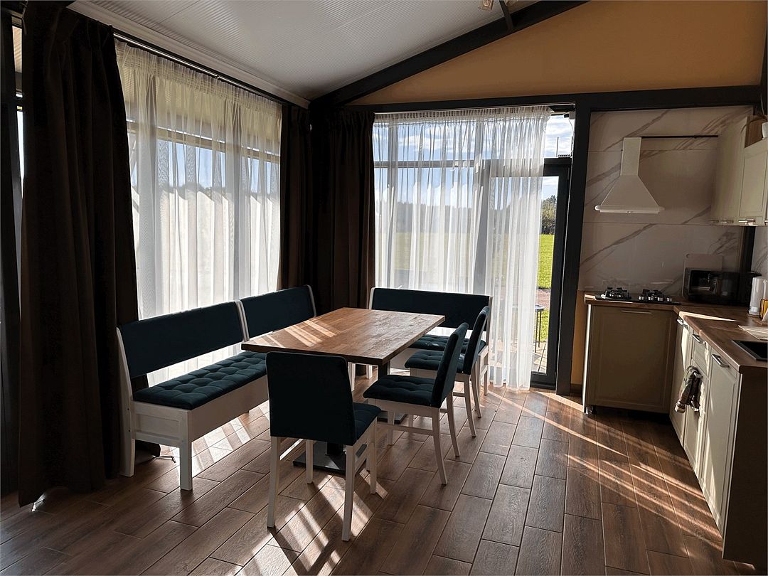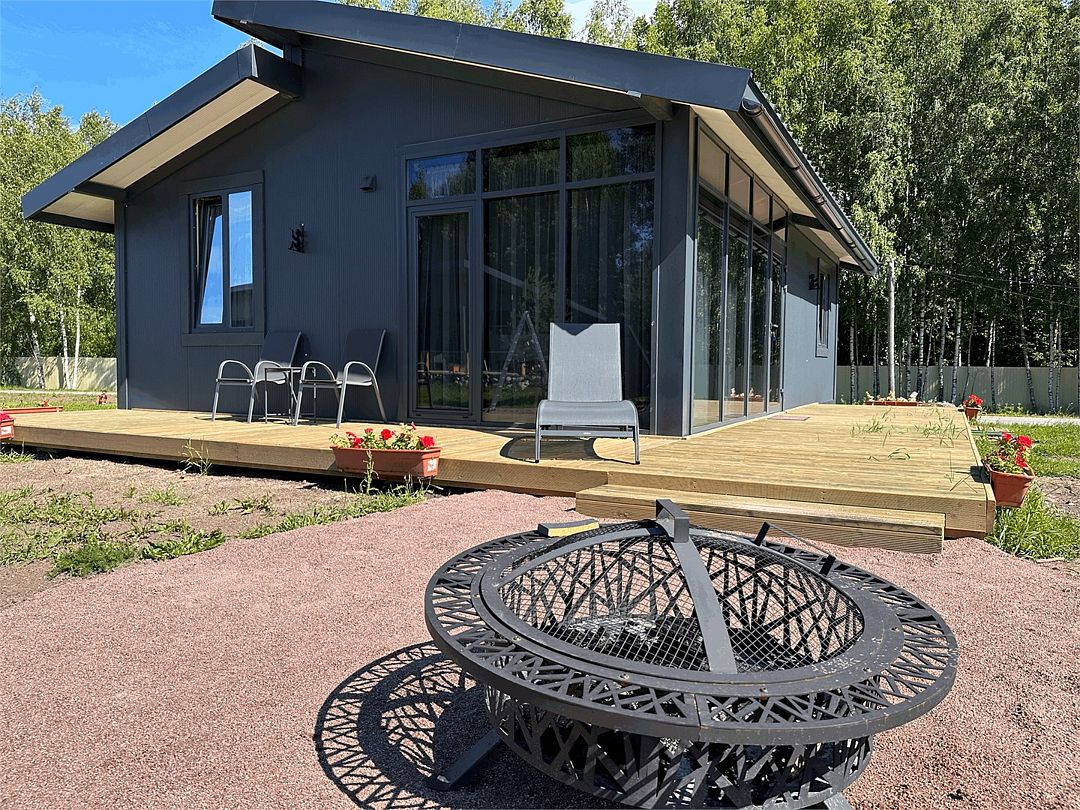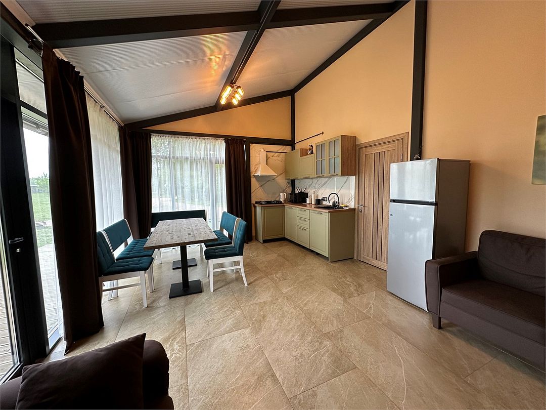 Современное оснащение домов соответствует европейскими стандартами. В каждом доме есть электрокамин, установлен теплый пол. Панорамные окна с выходом на собственную террасу, мангальную и костровую зону расширят пространство вашего отдыха. Отличный сервис и радушие персонала гостиницы, оставят самые положительные эмоции.