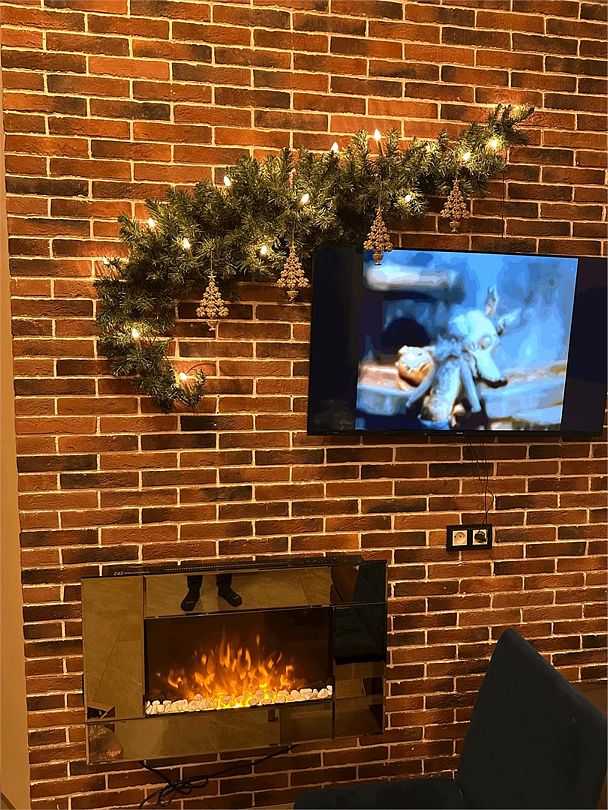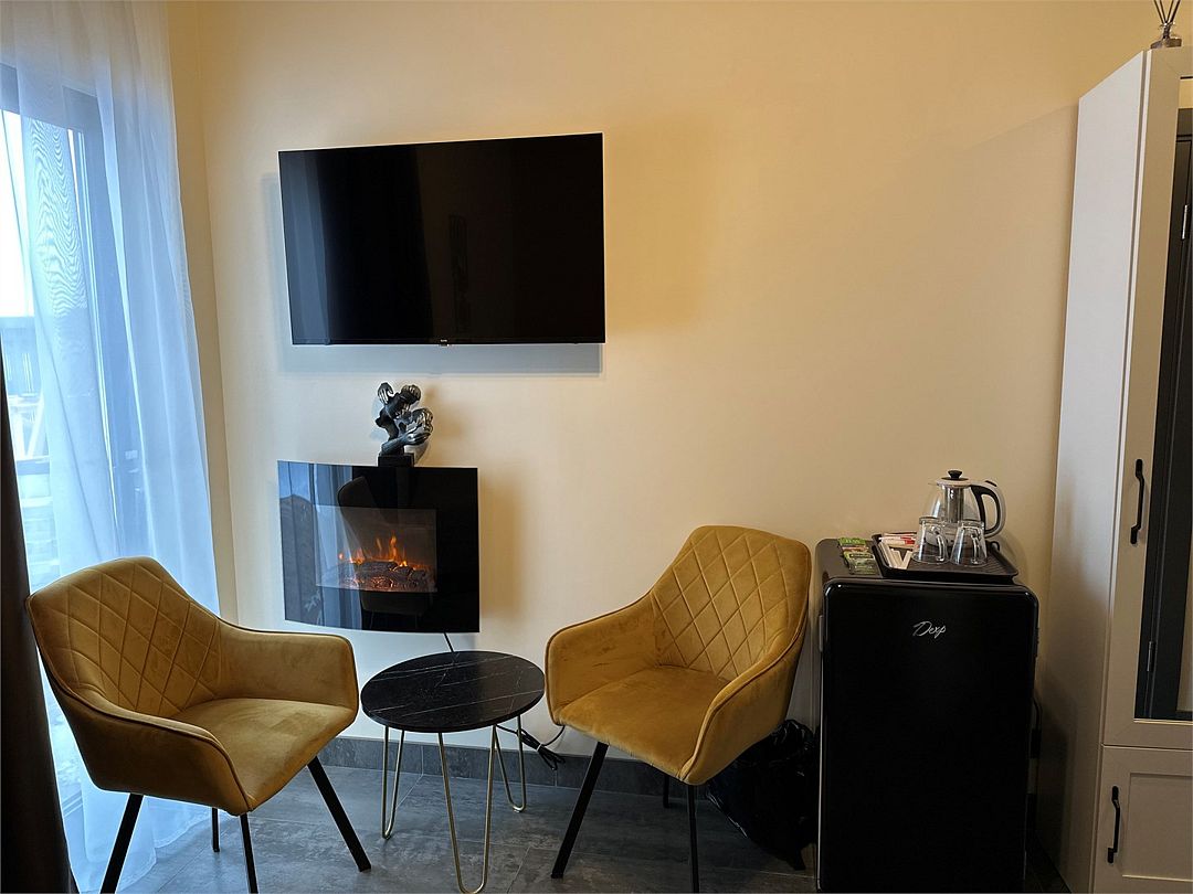 - в номере: тапочки, зубные щетки, полотенца, чайник, пакетированный чай, чашки, бокалы, шампунь, гель, греющий электрокамин, теплый пол, терраса, блэкаут.