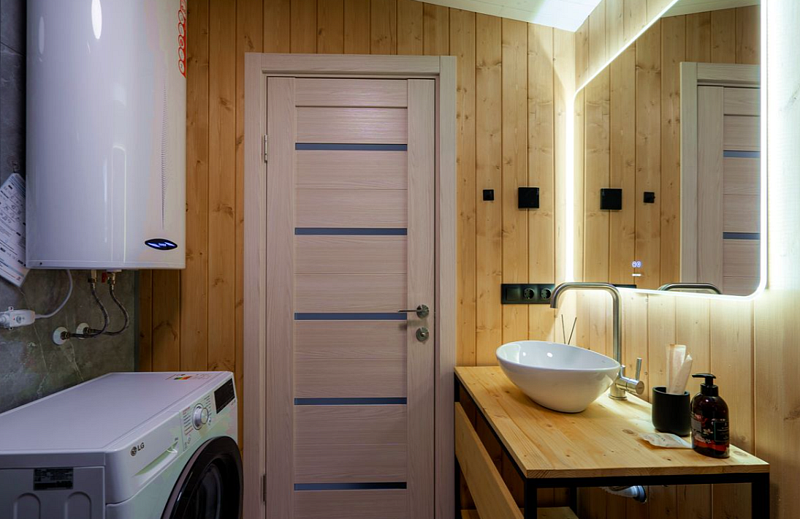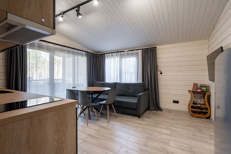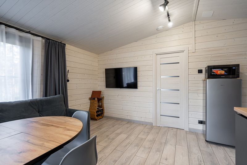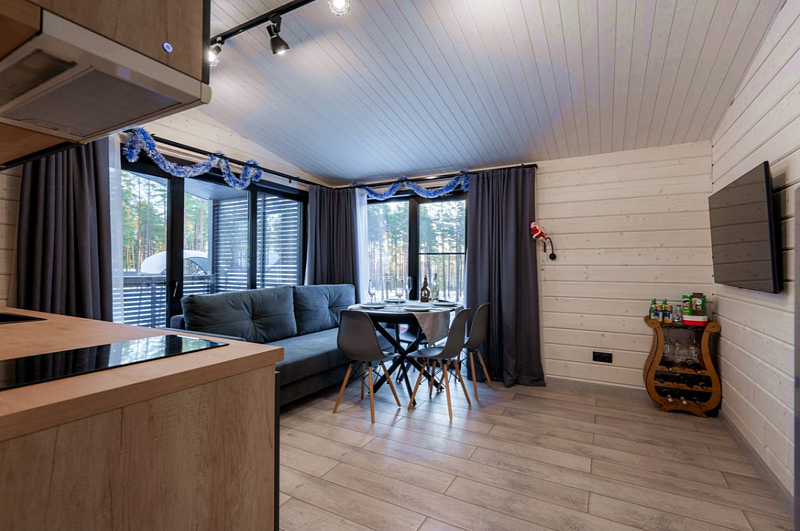 В коттедже две спальни, кухня-гостиная (площадь 25 кв. м), на террасе купель с горячей водой. В доме комфортно могут разместиться 4 человека.