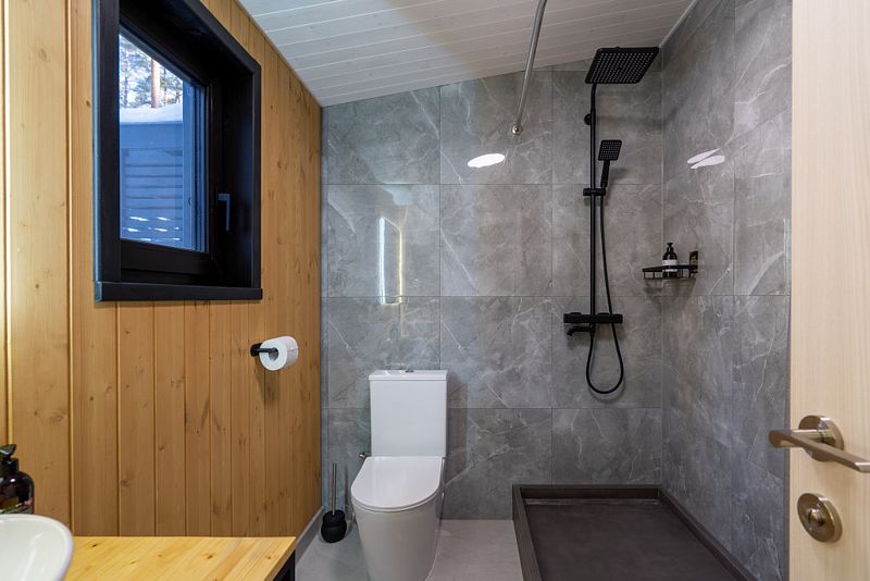 Коттедж оснащен всем необходимым для комфортного пребывания — от теплых полов до панорамных окон и просторной гостиной.