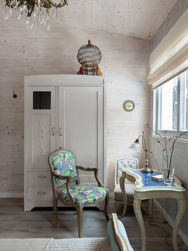 Внутреннее убранство поражает коллекционным антиквариатом, натуральным деревом и тёплым освещением. Здесь царит атмосфера настоящей дачной романтики, уединения и покоя, несмотря на расположение в городской черте, близко к центру Зеленогорска.