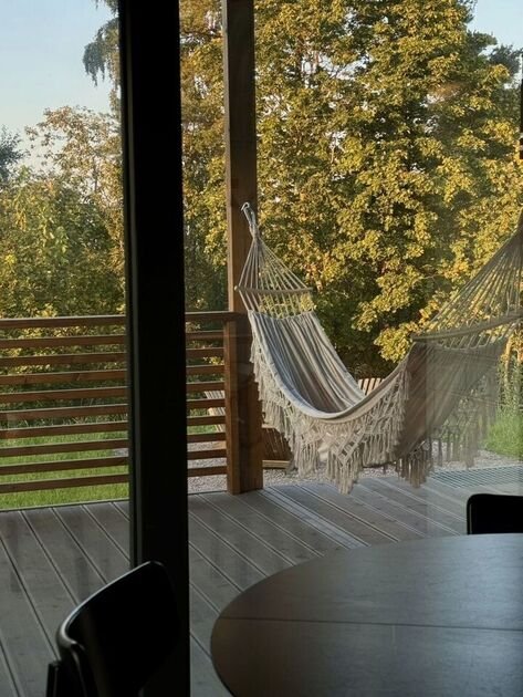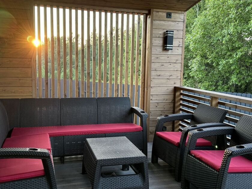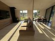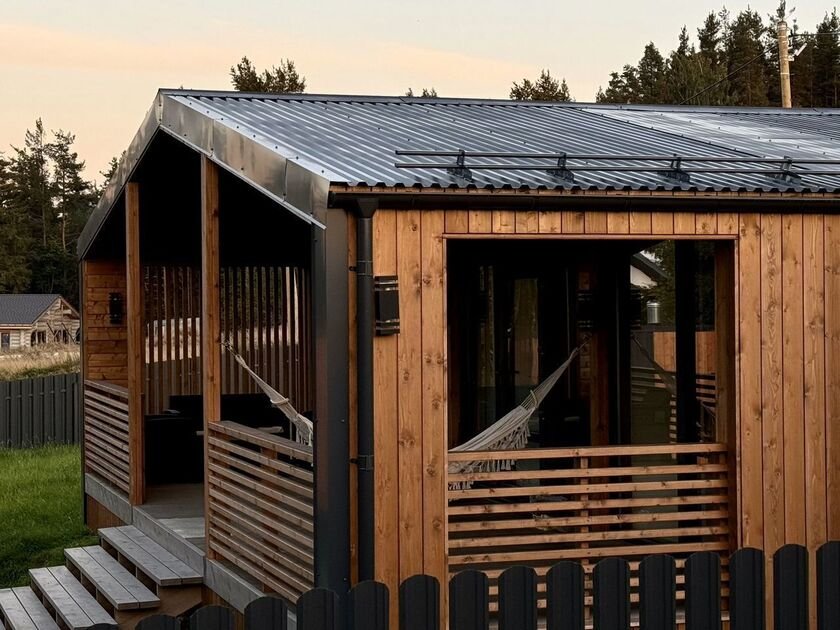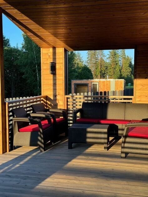 В доме есть большая терраса с навесом, на которой расположена удобная мебель для отдыха.