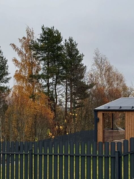 Сохранены деревья, сделана парковка и дорожки, установлен забор по периметру.