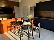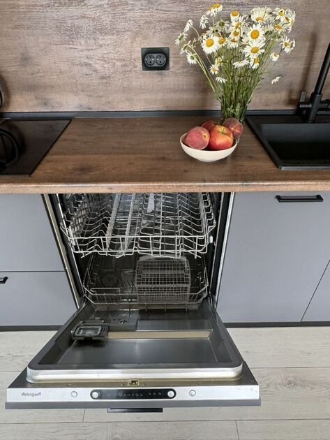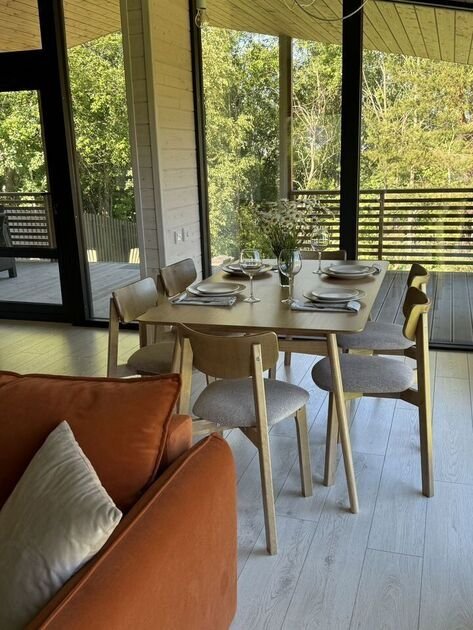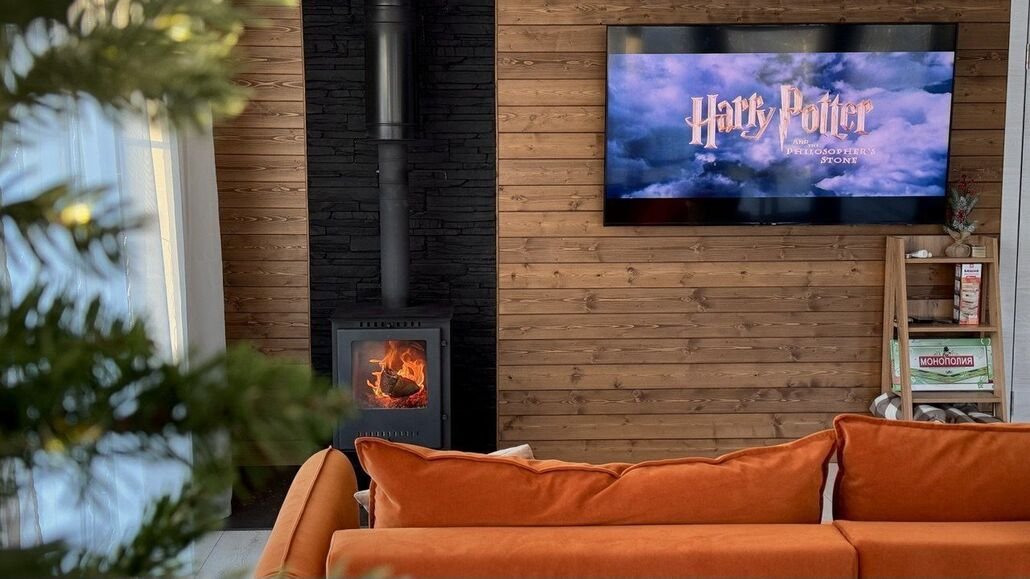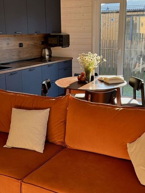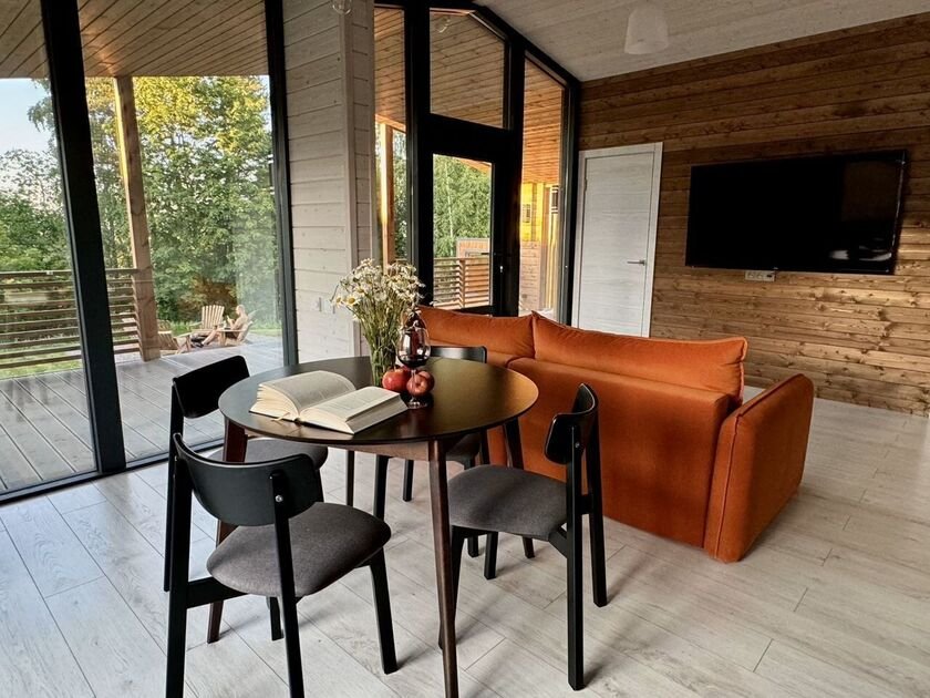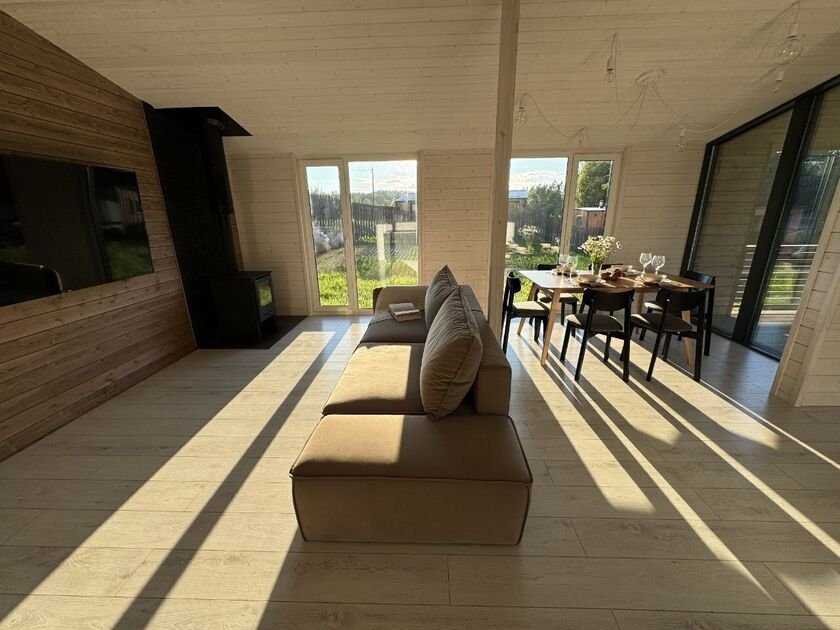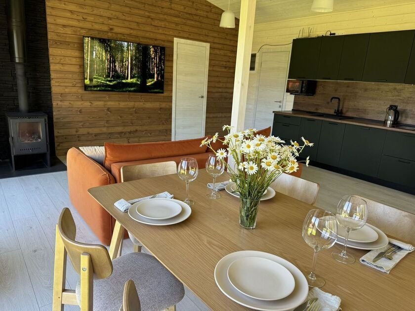 Просторная кухня-гостиная оборудована встроенной техникой, включая холодильник, плиту, посудомоечную и стиральную машины. Гостям предоставляется полный набор посуды для приготовления и сервировки. В уютной зоне отдыха вы найдете диван, телевизор, большой обеденный стол и атмосферный дровяной камин.