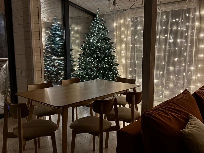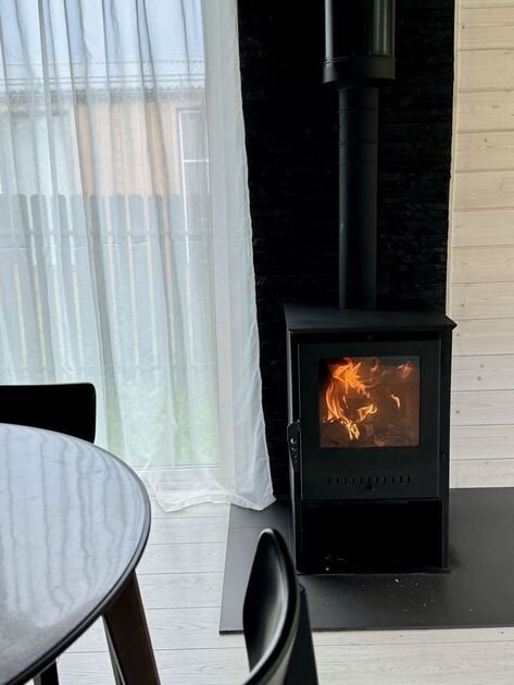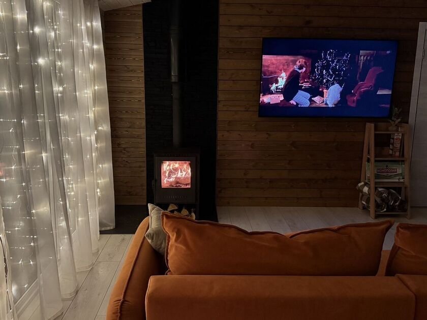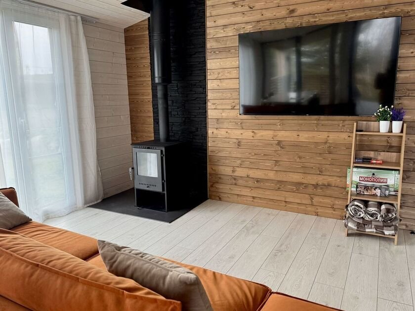 В кухне-гостиной стоит дровяной камин, диван, тв, стол, стулья, установлена встроенная кухня с техникой, холодильник, плита, посудомойка, стиральная машинка, фен, высокоскоростной wi-fi 100 мб, так же полный набор посуды и кухонными принадлежностями.