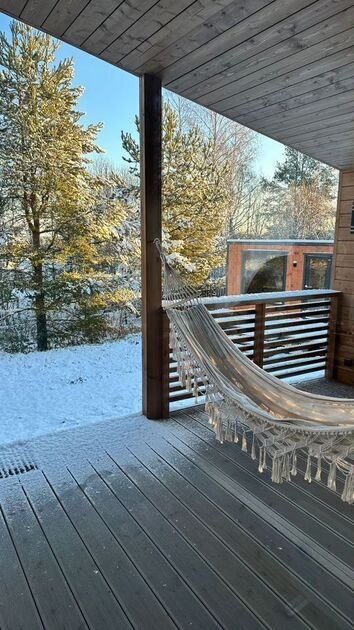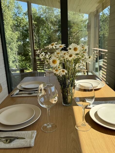 На территории дома: парковка на 3 а/м, костровая зона с удобными креслами, мангалом. В доме есть большая терраса с навесом, на которой расположена удобная мебель для отдыха.