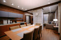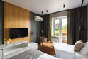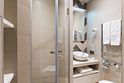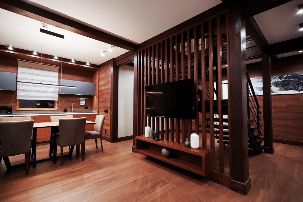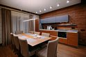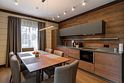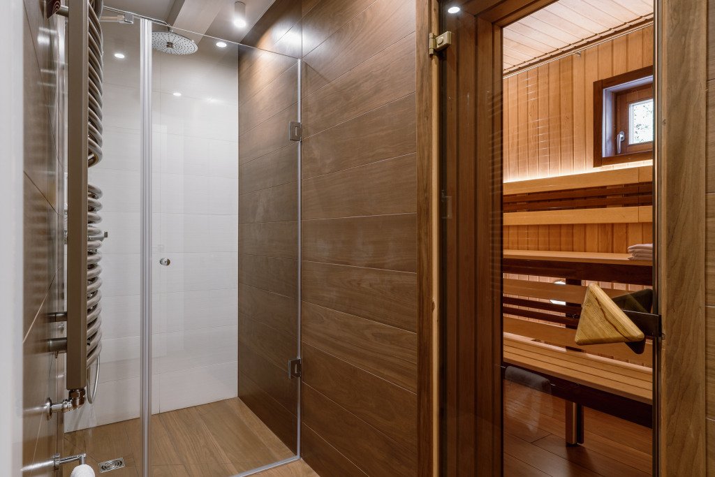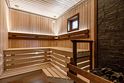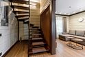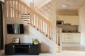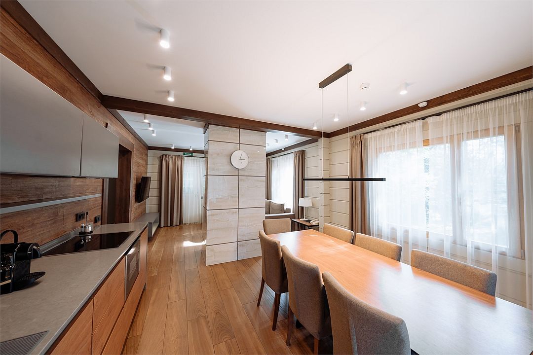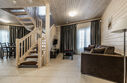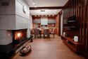 - на первом этаже коттеджа расположены современная кухня с премиальной техникой NEFF Liebherr, гостиная с камином, телевизором и обеденной зоной, терраса, сауна, сушильный шкаф, а также спальня с двумя раздельными кроватями и собственной ванной комнатой;