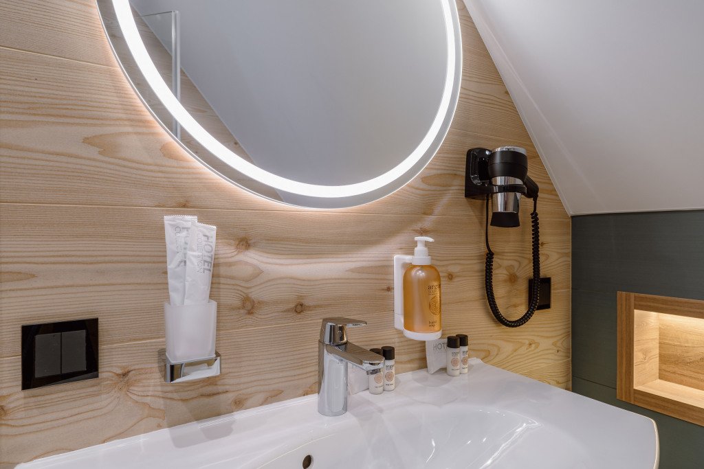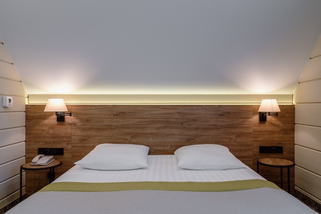 Номера в отеле выполнены в скандинавском стиле: мягкие пастельные тона, мебель из натурального дерева.