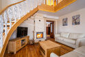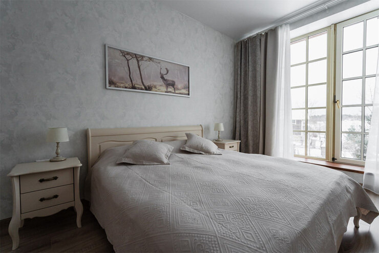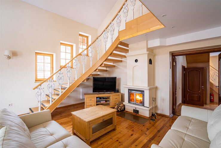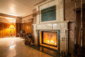 В доме 2 санузла, большая гостиная с камином, кухня и столовая. На первом этаже: просторная прихожая, двухместная спальня, санузел, кухня , столовая и гостиная с камином. На втором этаже: 4 спальни (2 двухместные, 2 одноместные), санузел.