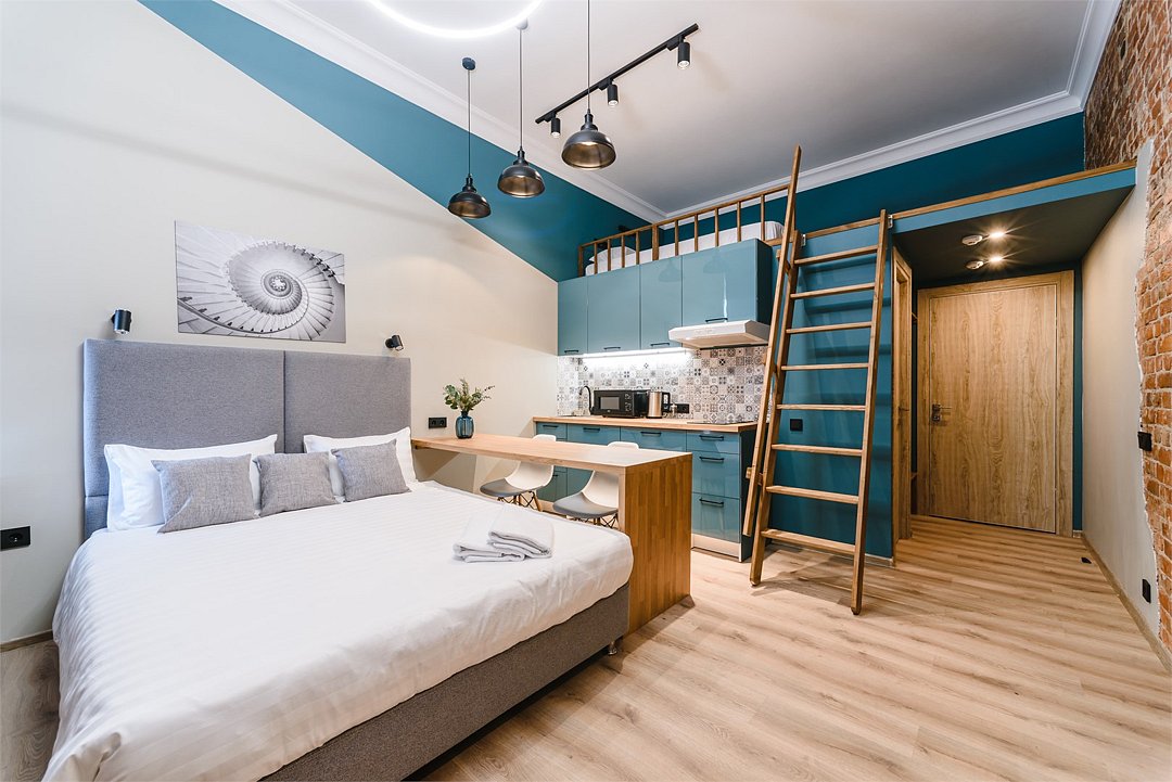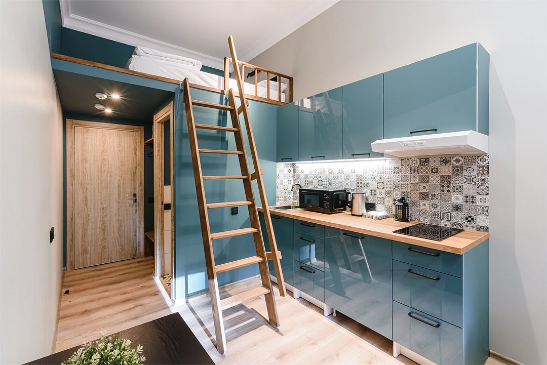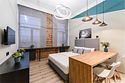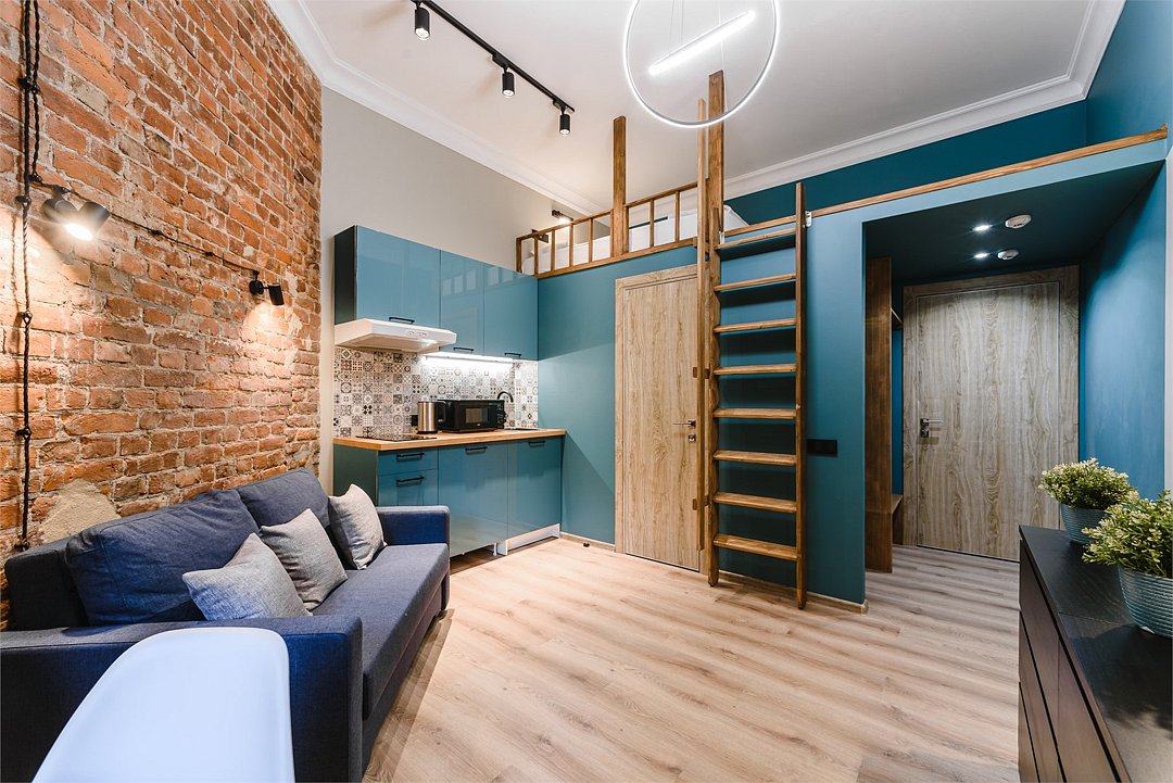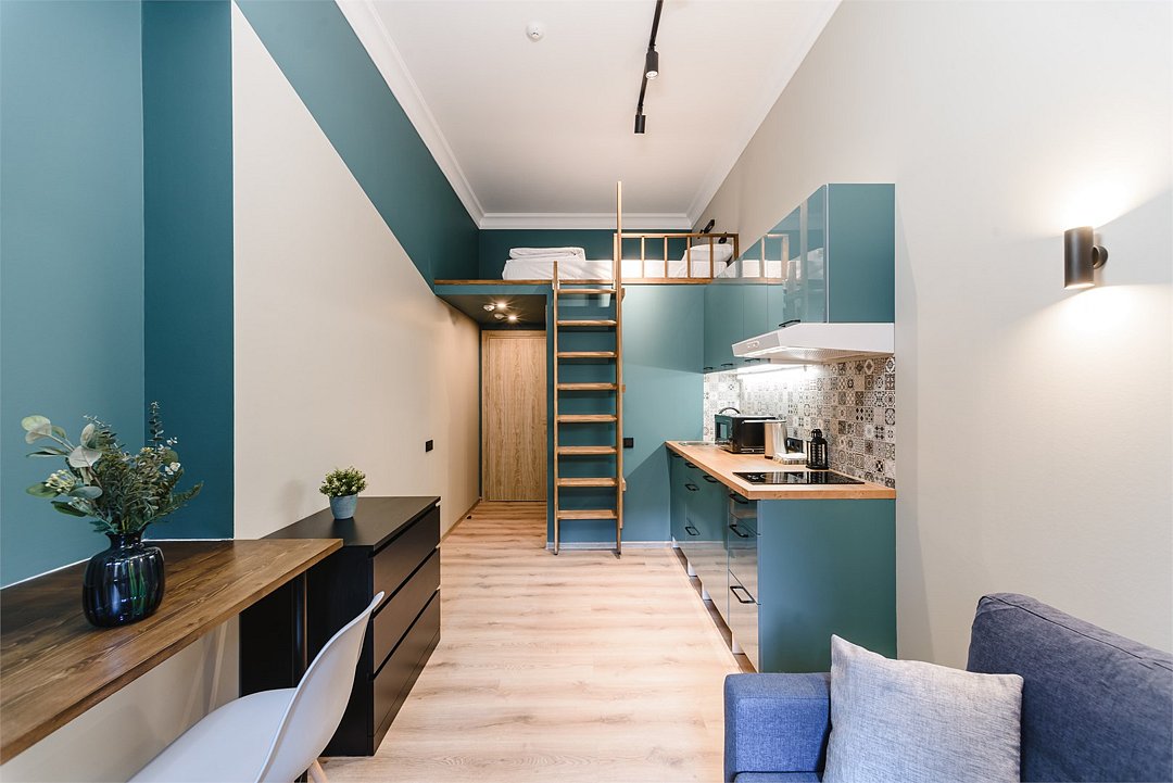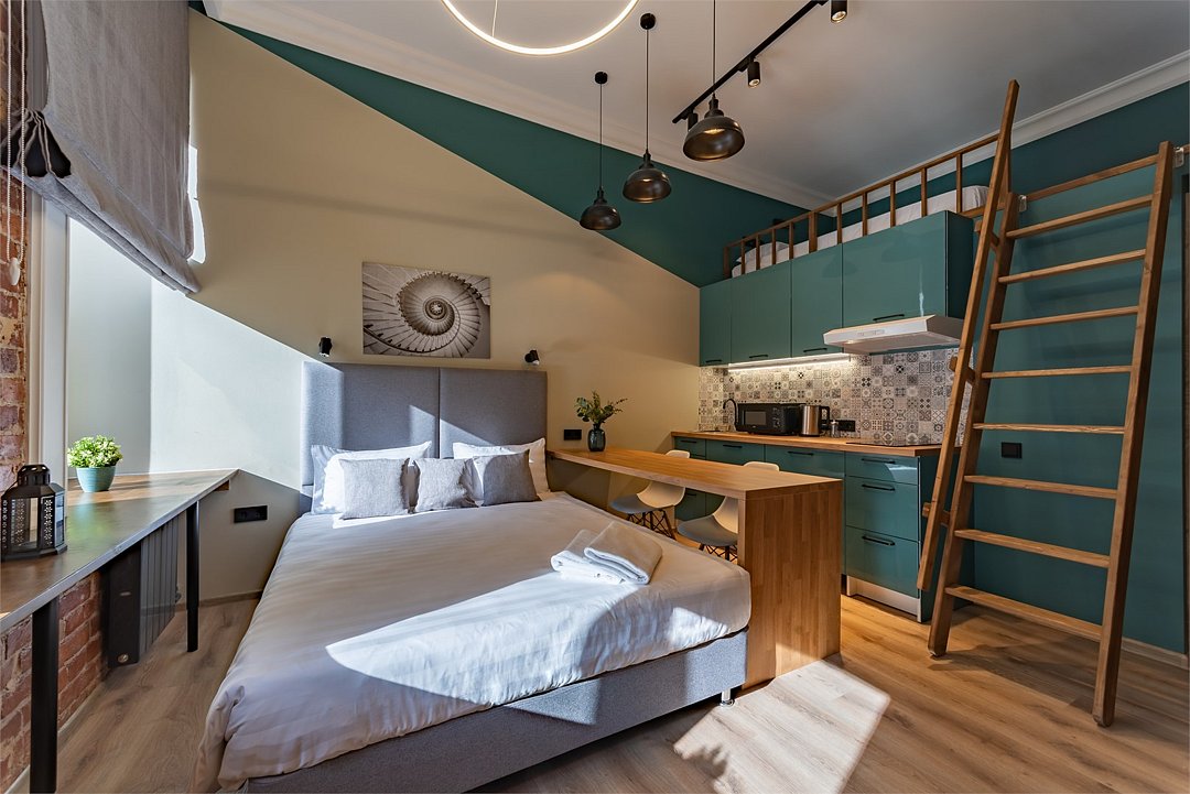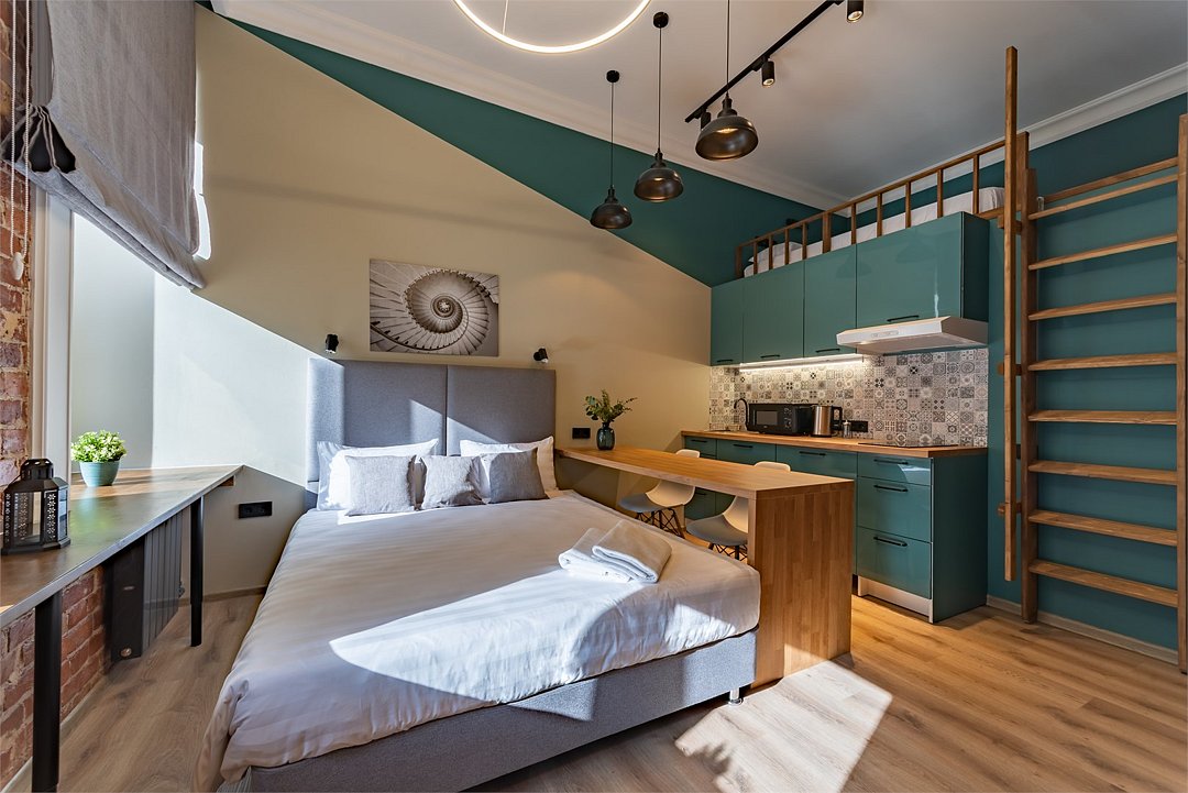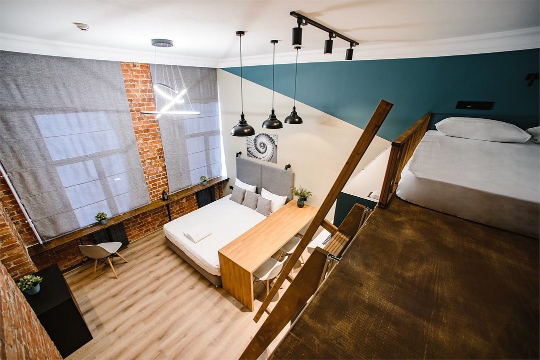 Мы рады предложить Вам улучшенные апартаменты площадью 18 м² со стильным дизайном с элементами Loft, рассчитанные на проживание до 3-х гостей включительно. Апартаменты включают в себя: - просторное спальное место на втором ярусе и диван в качестве дополнительного спального места; - кухонную зону с плитой, микроволновой печью, чайником и всей необходимой посудой; - высокоскоростной интернет и Smart-TV; - личные удобства с душем, фен, набор полотенец для каждого гостя. В общей зоне для Вас кулер с питьевой водой, стиральная машина, утюг и гладильная доска.Услуги и удобства