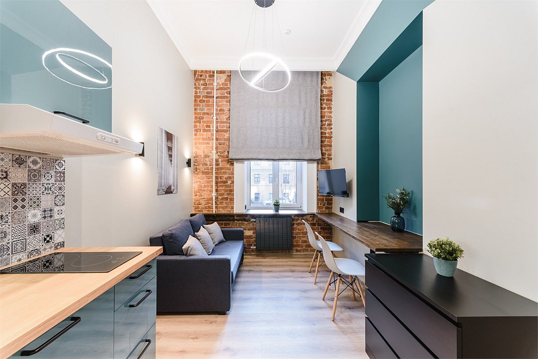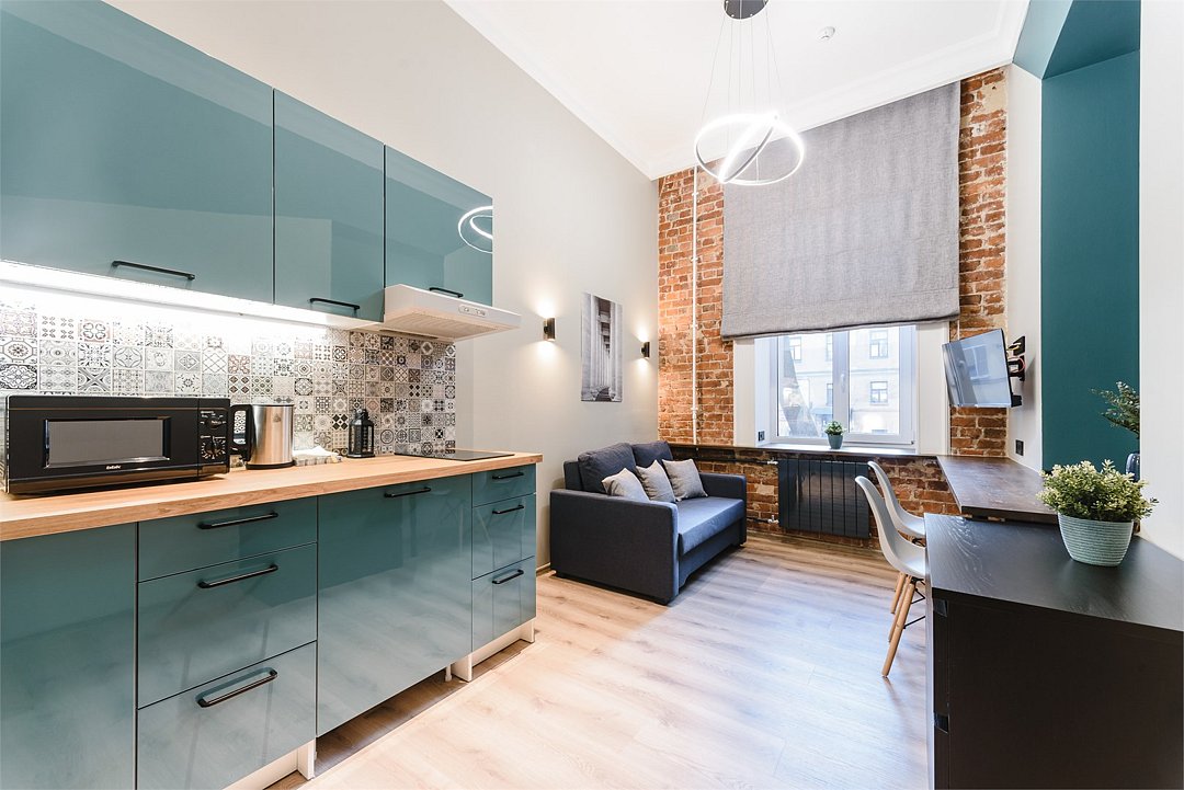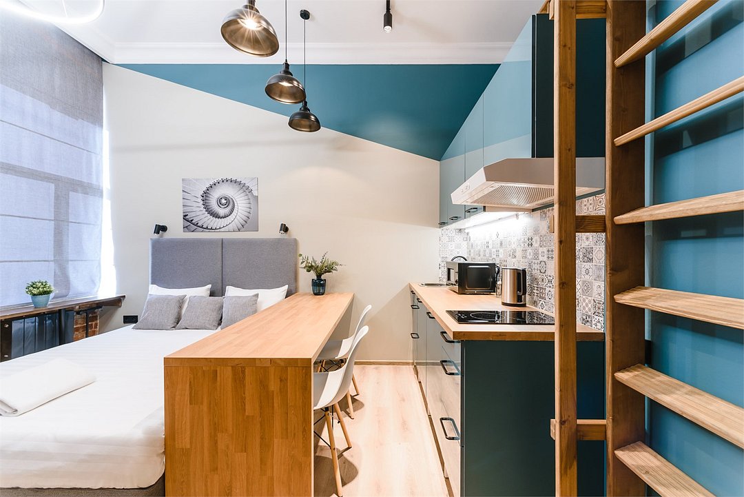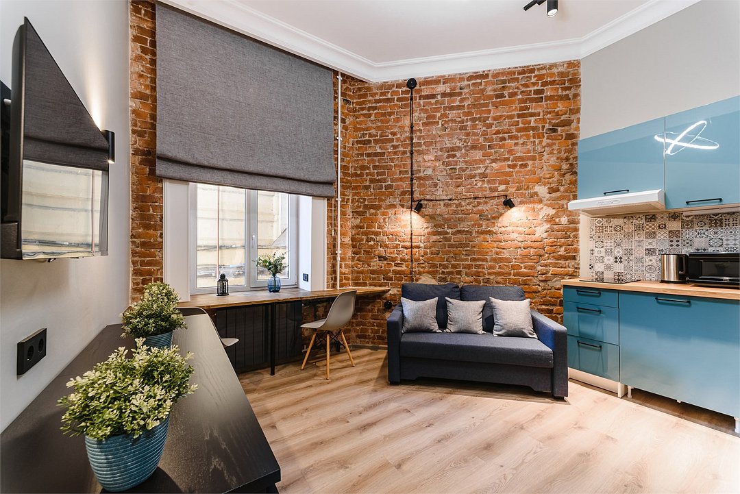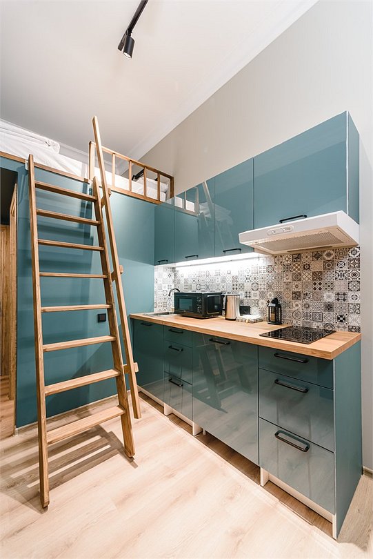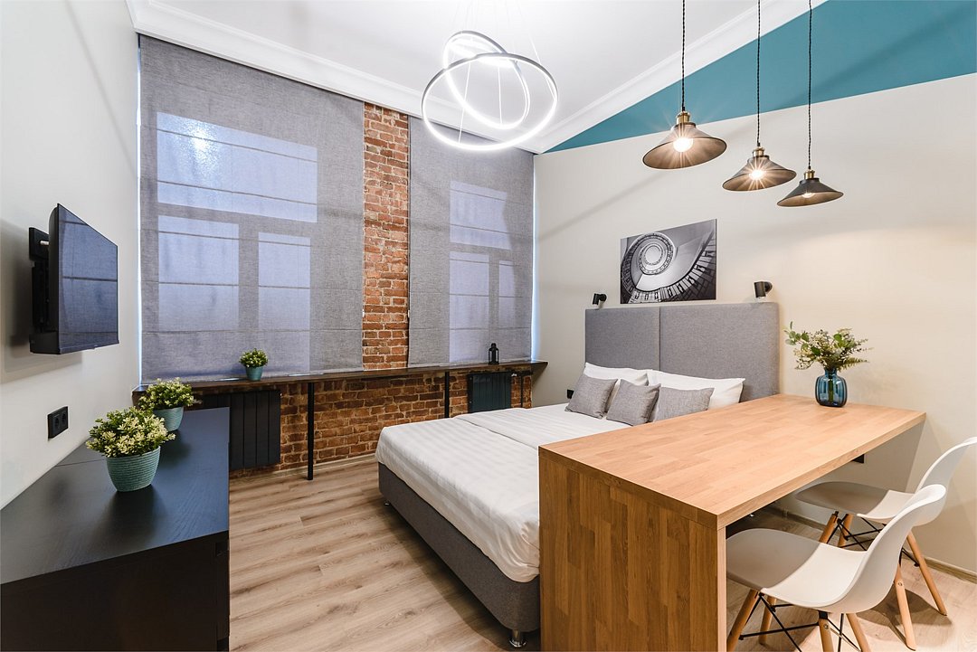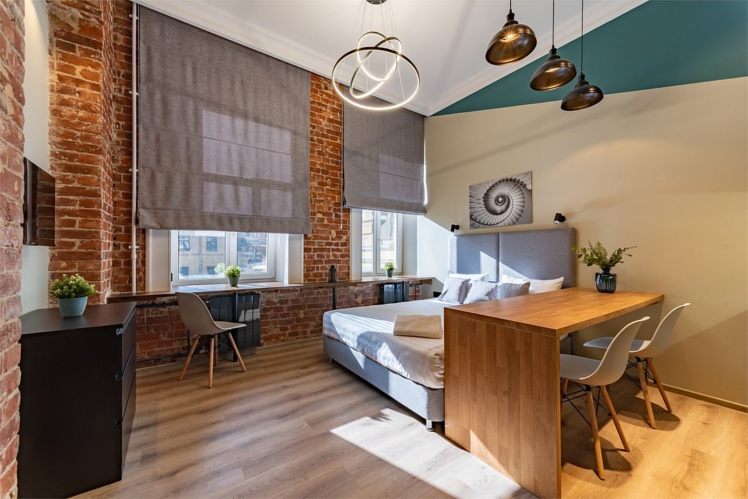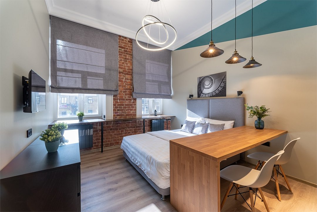 Мы рады предложить Вам улучшенные апартаменты площадью 18 м² со стильным дизайном с элементами Loft, рассчитанные на проживание до 3-х гостей включительно. Апартаменты включают в себя: - просторное спальное место на втором ярусе и диван в качестве дополнительного спального места; - кухонную зону с плитой, микроволновой печью, чайником и всей необходимой посудой; - высокоскоростной интернет и Smart-TV; - личные удобства с душем, фен, набор полотенец для каждого гостя. В общей зоне для Вас кулер с питьевой водой, стиральная машина, утюг и гладильная доска.Услуги и удобства