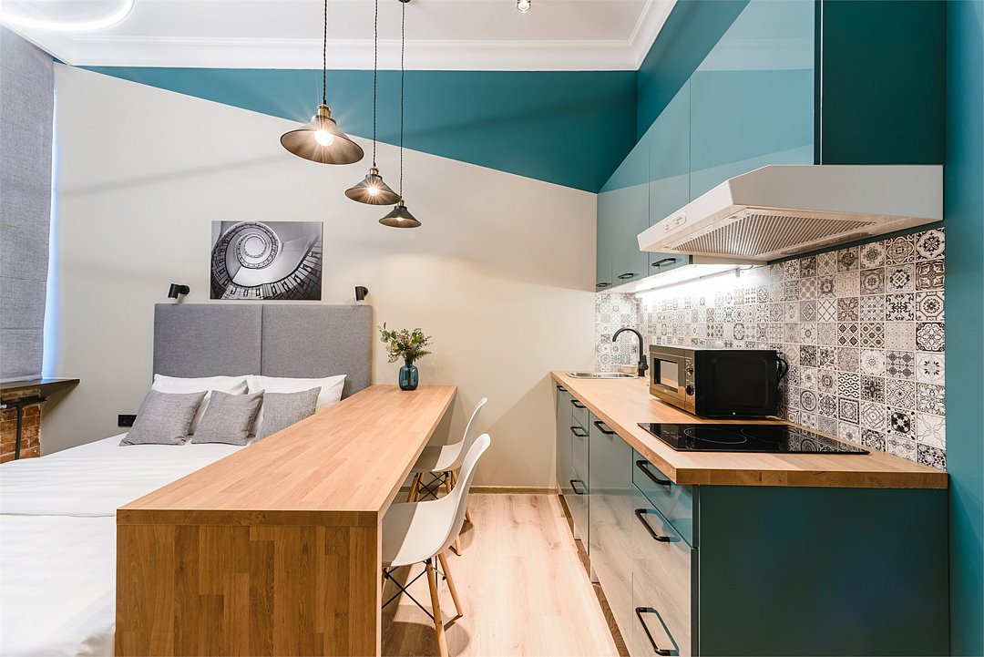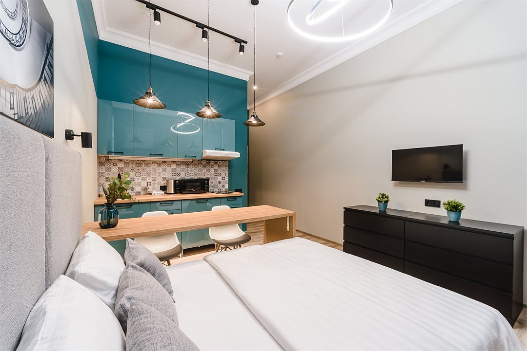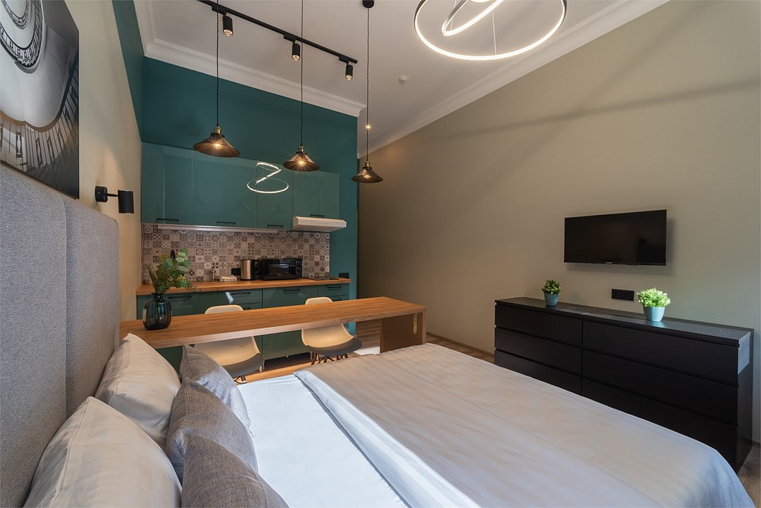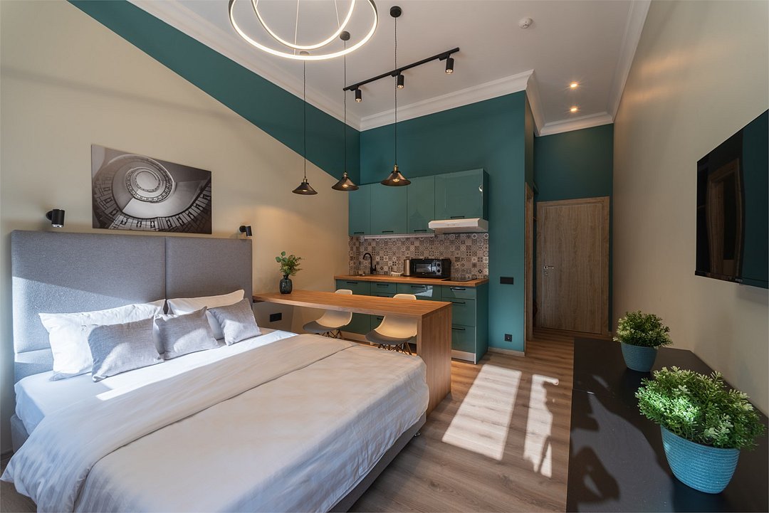 кабельное телевидение, Wi-Fi, светильник, фен, плита для приготовления пищи, микроволновая печь, банные полотенца, тапочки, гигиенические средства, двуспальная кровать, ортопедический матрас, стулья, зеркало, комод, кухня, чайный набор, набор посуды, чайник, унитаз, раковина, обеденная зона, отопление, душ, кулер на этаже, вид во двор, высокие потолки, кухонная посуда, столовые приборы, стол, телевизор с плоским экраном, мини-холодильник, телевизор со Smart TV, номер для некурящих, чайная станция, вешалки-плечики, мыло, без питомцевВ апартаментах