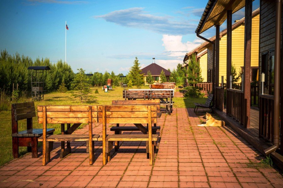 - удобства около дома: открытая терраса, на улице деревянный стол со скамьями, большой и/или малый мангал на выбор.