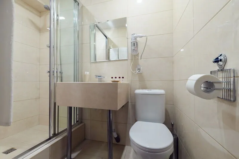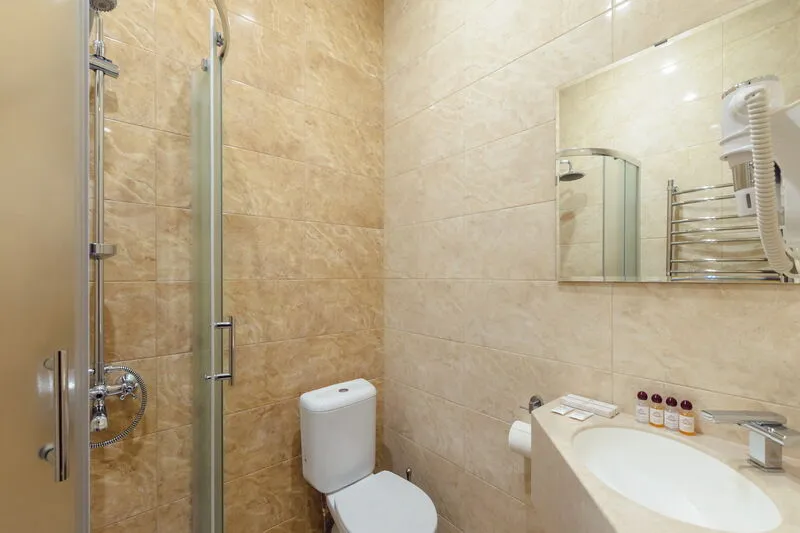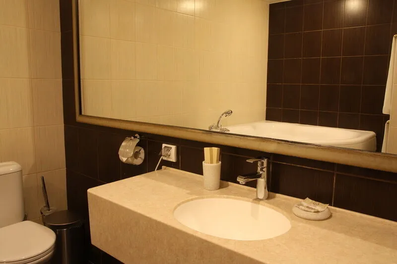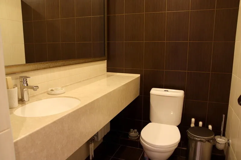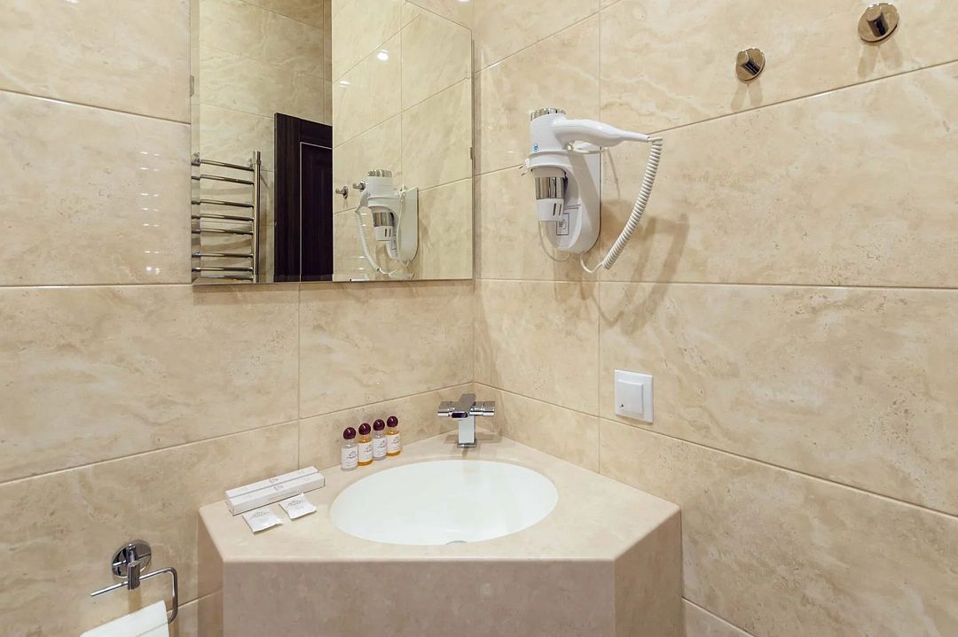 туалет, раковина, средства личной гигиены, фен, набор полотенец.