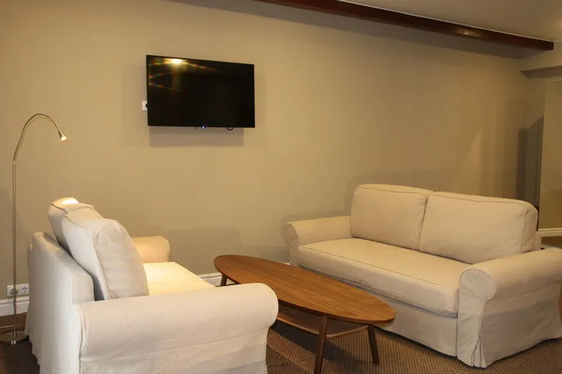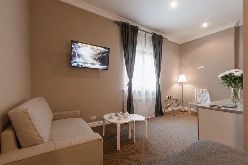 В номере: телевизор, санузел, душ, холодильник, мягкая мебель, халаты, тапочки, фен.